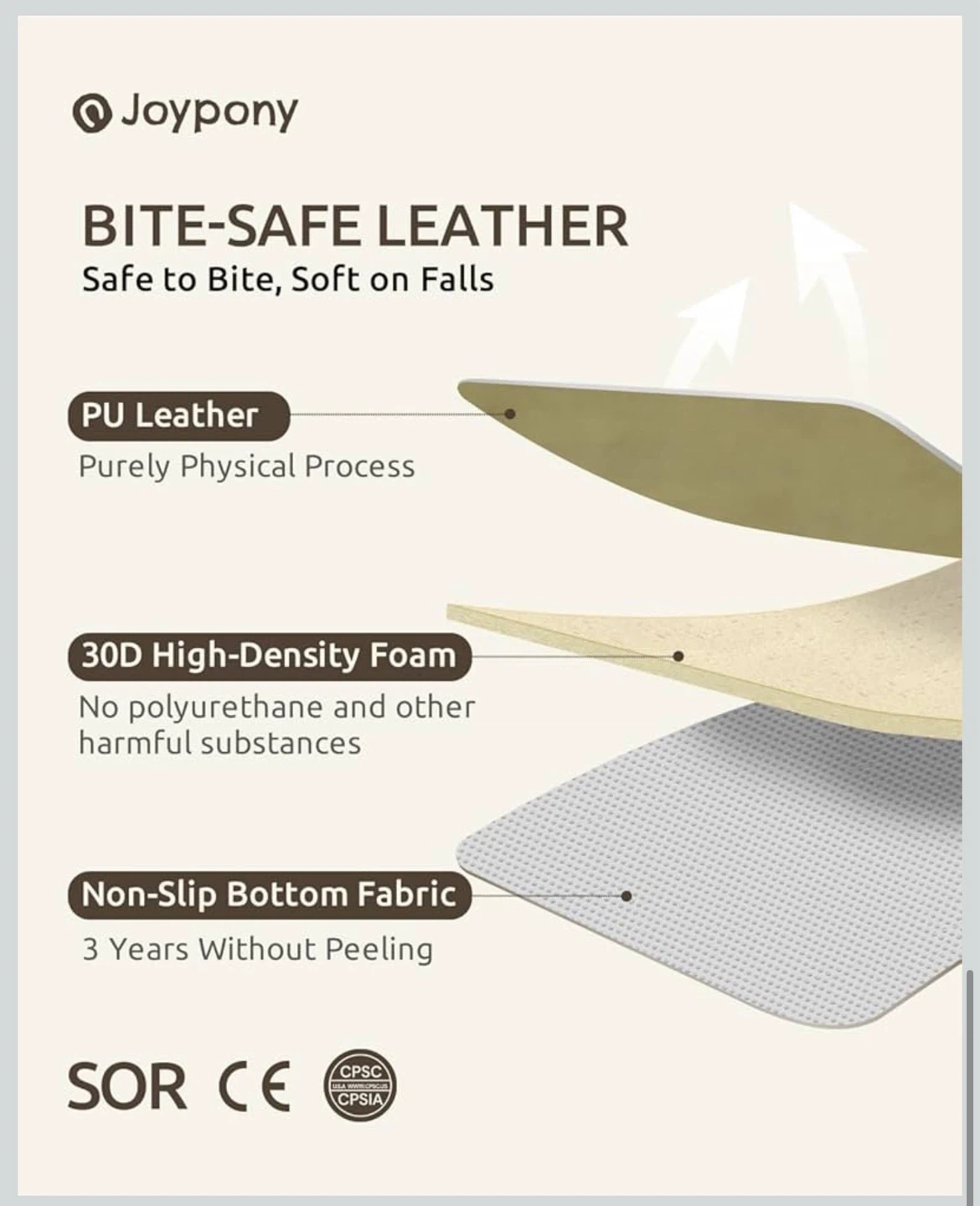 This Joypony play mat is perfect for your little one! It measures 50x50 inches and is made with 30D high-density foam, offering zero sagging and locked support. Features: - Bite-safe leather that is safe to bite and soft on falls - Non-slip bottom fabric that lasts for 3 years without peeling - Wear and scratch-resistant material