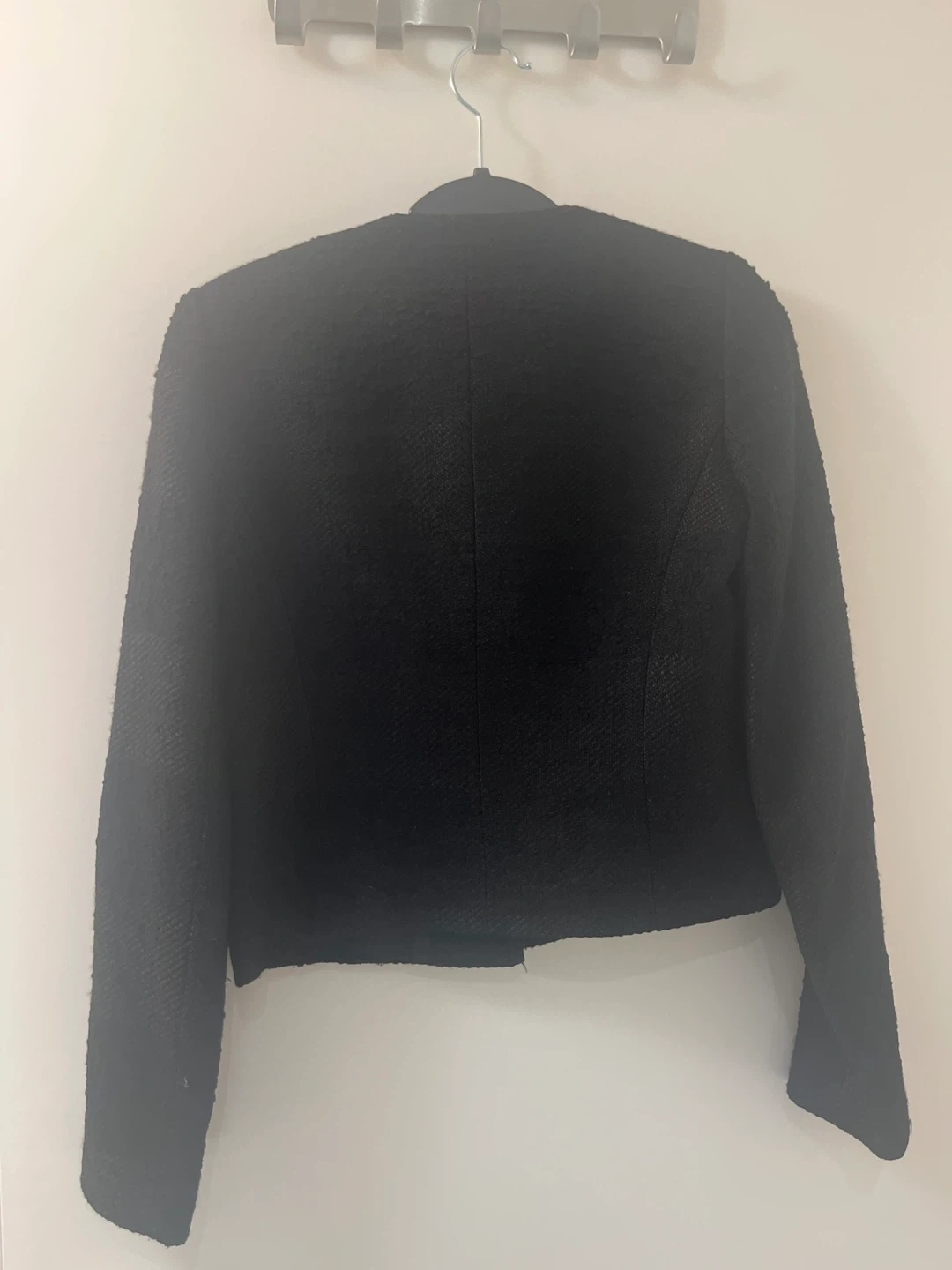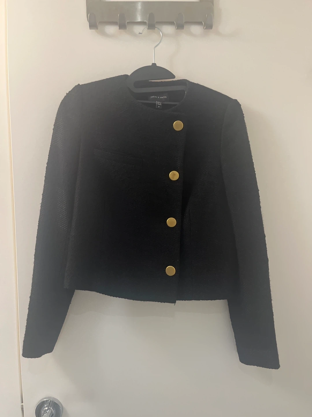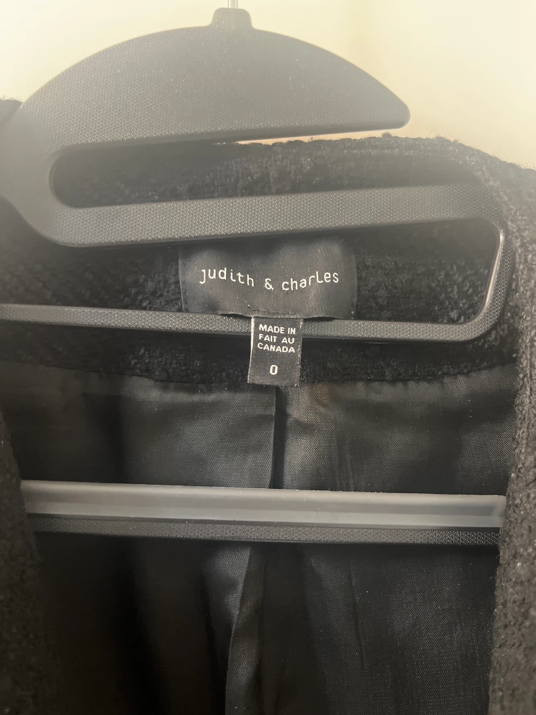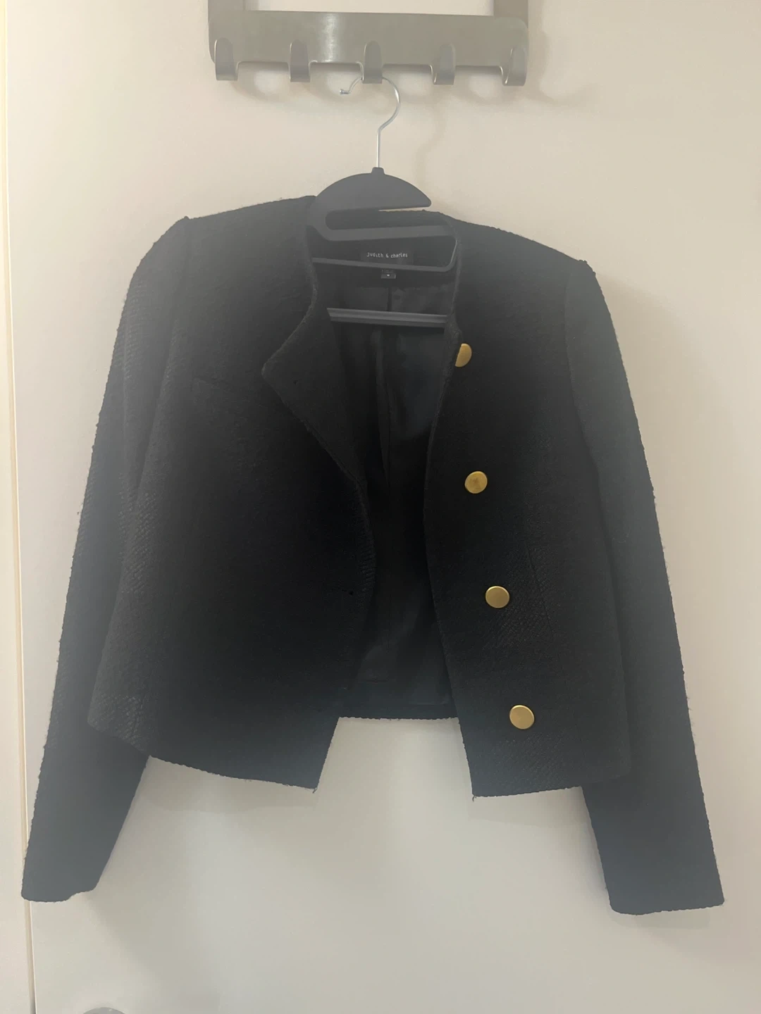 Selling a stylish Judith & Charles black jacket in size 0. It's in great condition and ready for a new home! This chic jacket features a classic design with gold button accents. Perfect for adding a touch of sophistication to any outfit