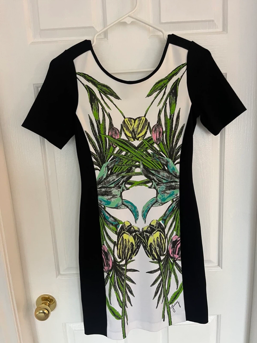 This Juicy Couture dress features a unique floral design on a white background with black accents. It has short sleeves and a zipper down the back. Perfect for a stylish and comfortable outfit!