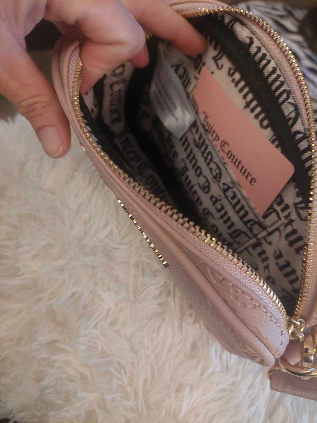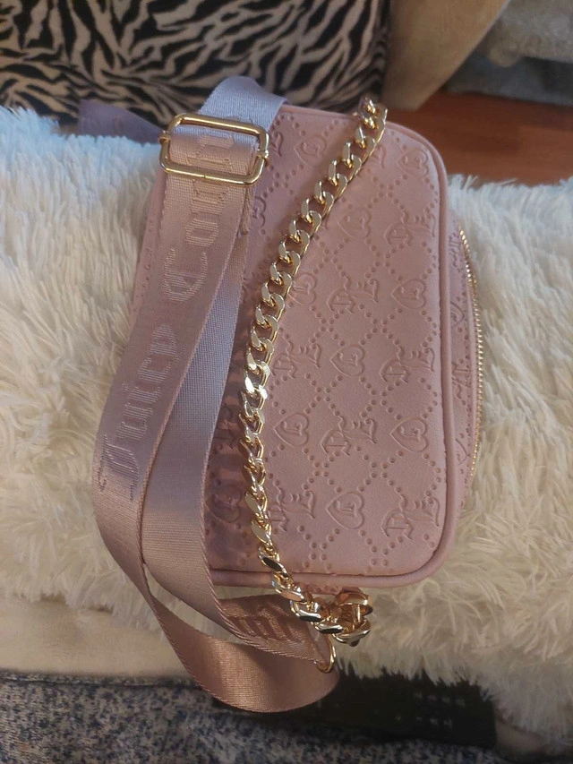 Step out in style with this Juicy Couture crossbody bag, perfect for keeping your essentials close! This compact bag features the iconic Juicy Couture design with a subtle, repeating crown and heart pattern embossed on a blush-pink faux leather. The bag has a zip-top closure to secure your belongings, and an adjustable crossbody strap for comfortable wear, in used but good condition. Features: - Brand: Juicy Couture - Colour: Blush Pink - Material: Faux Leather - Adjustable Crossbody Strap - Zip-Top Closure - Gold-Tone Hardware Looking to add a touch of glam to your everyday look? This crossbody bag is just the ticket! If the ad is up, it's available!