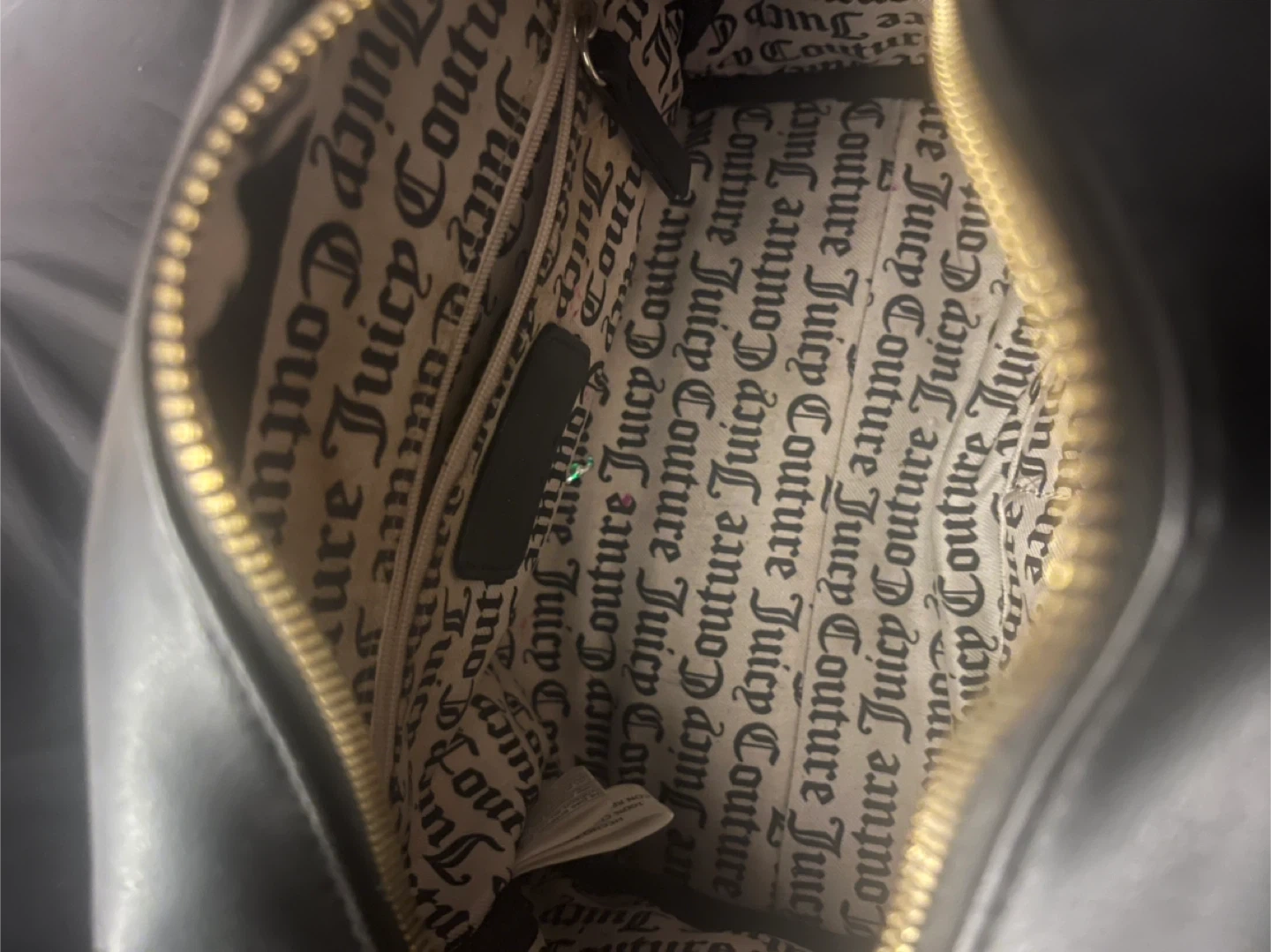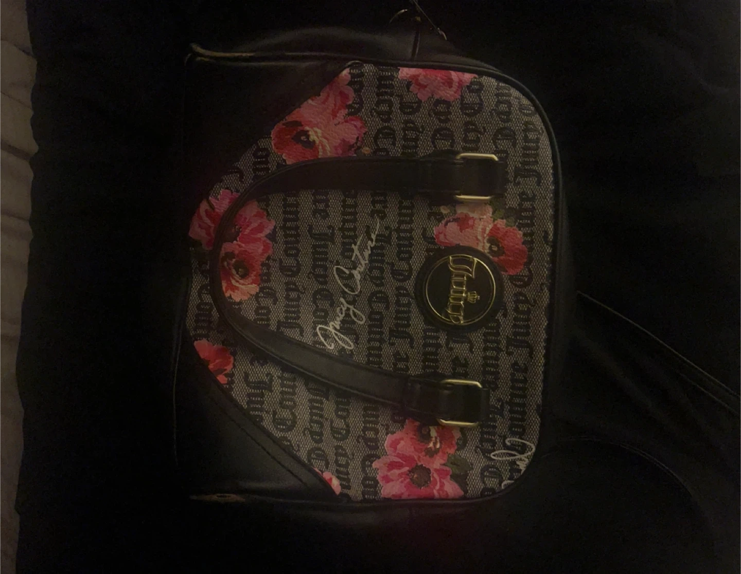 Selling a cute Juicy Couture backpack with a floral design! It features the Juicy Couture logo and a black leather trim. The interior lining also has the Juicy Couture logo printed throughout. It's in great condition!
