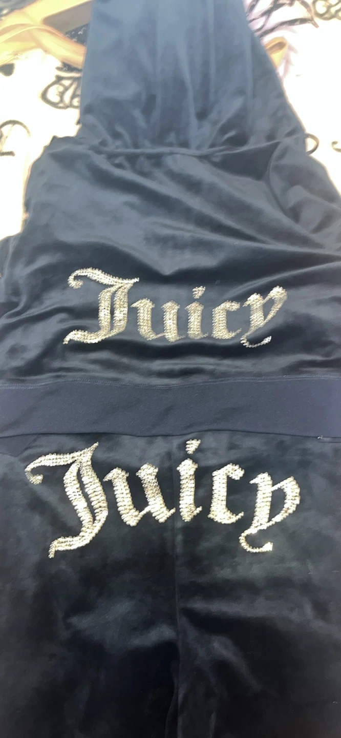 Selling a Juicy Couture Navy velour tracksuit! The brand name is written on the back of both the top and bottom in silver rhinestones. Perfect for lounging or running errands. Size XL never worn