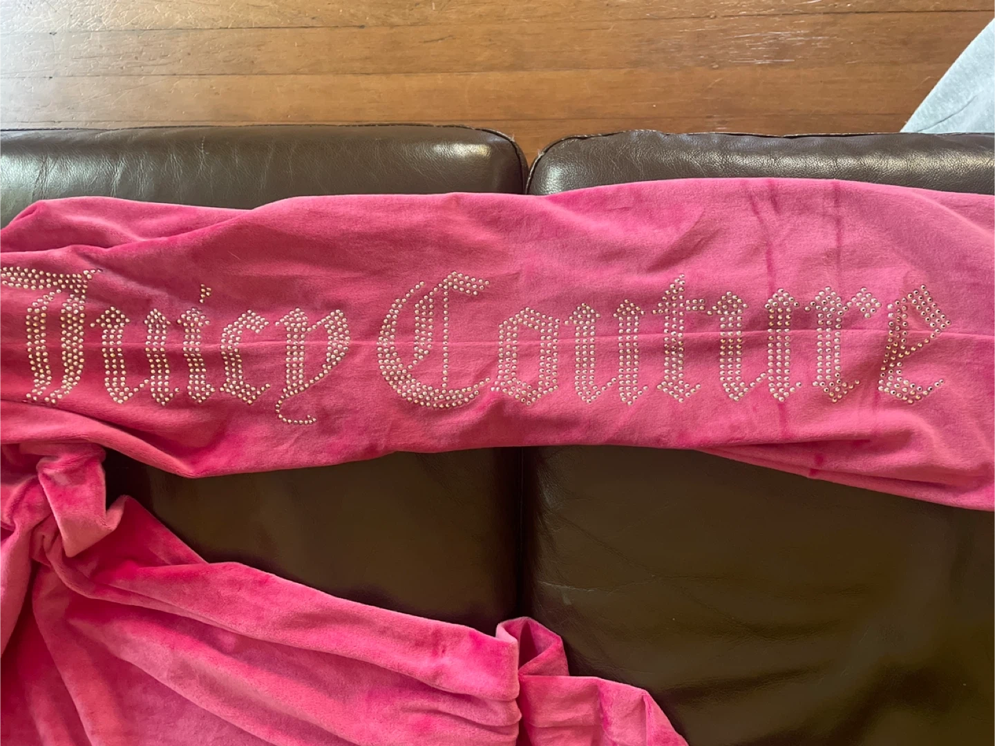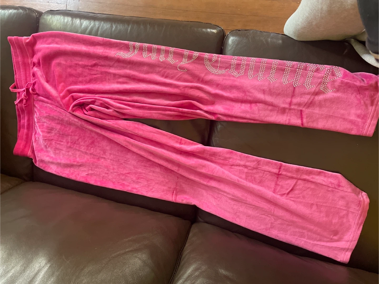 17Selling a pair of Juicy Couture track pants in a vibrant pink colour. These are made of soft velour material and feature the Juicy Couture logo in rhinestones. Size is Medium. Perfect for a comfy and stylish look!
