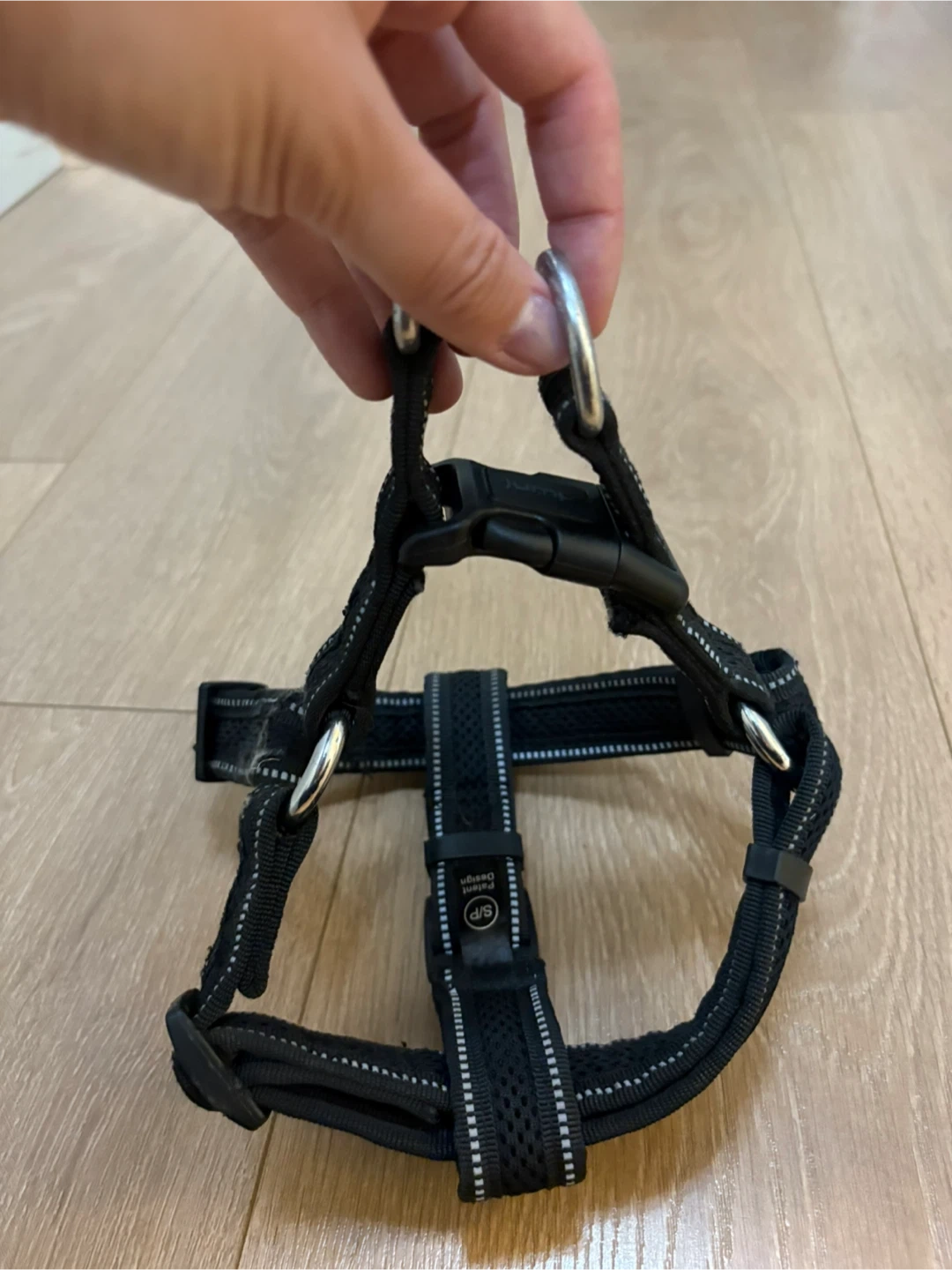 Selling a Jump brand dog harness in size small/medium. It’s black with reflective trim and has a comfortable, breathable mesh design. Perfect for small dogs!