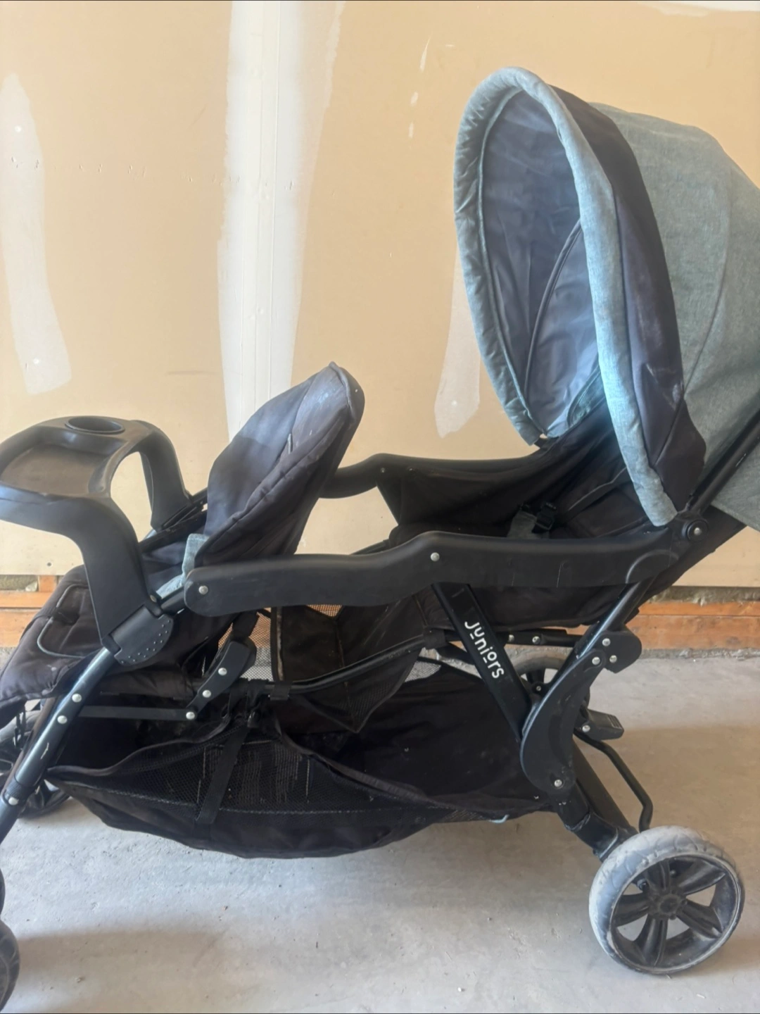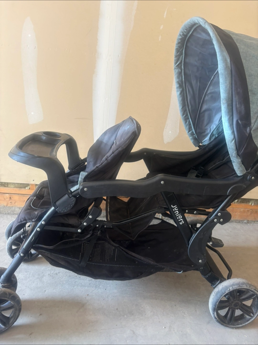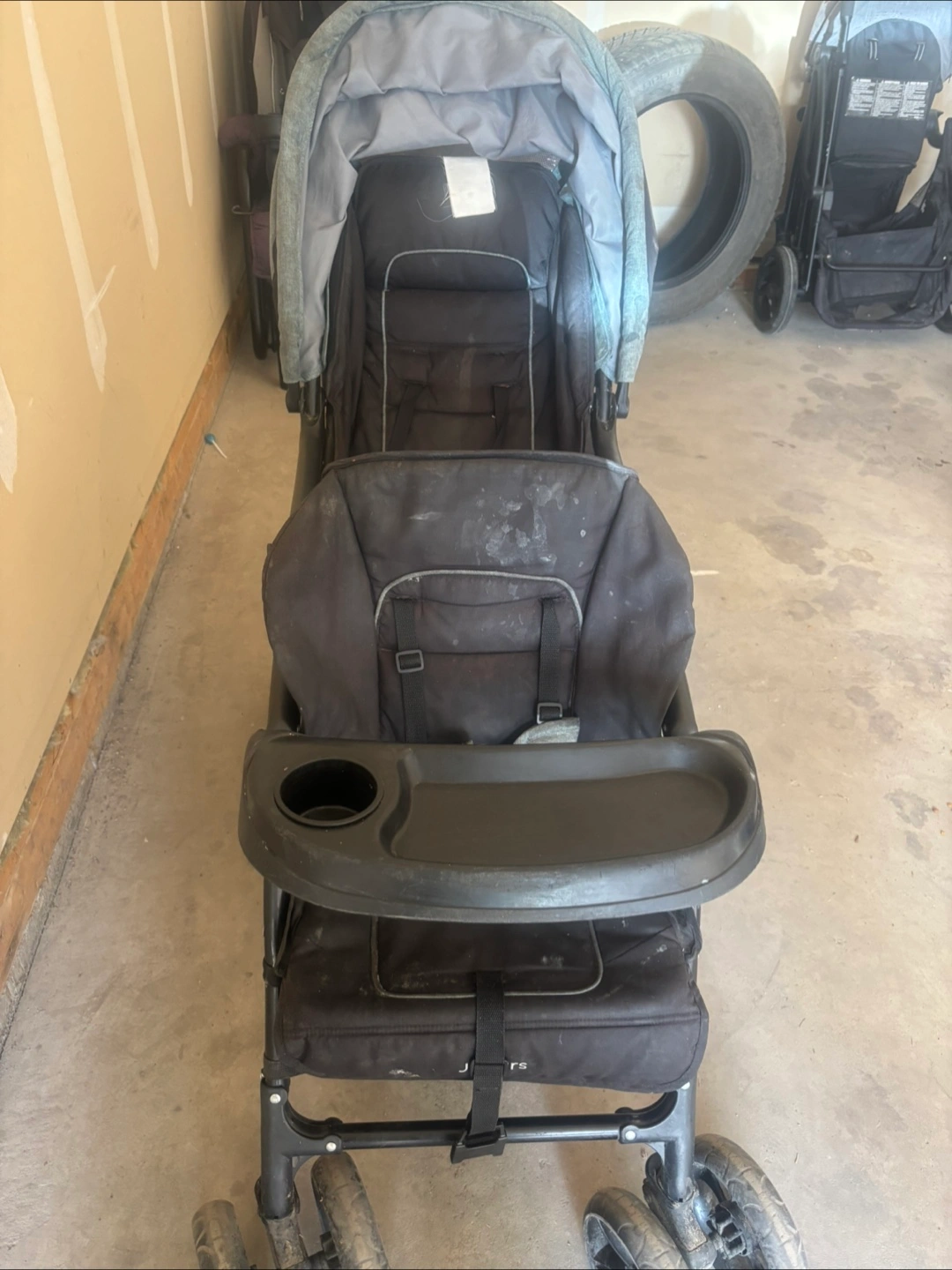 Selling a junior brand stroller in black. It's got a handy tray for snacks and drinks for your little one. It missing one canopy but still in very good condition just need to be clean. Othwise wheels everything work great and good in price too. It take small space and easy to carry.