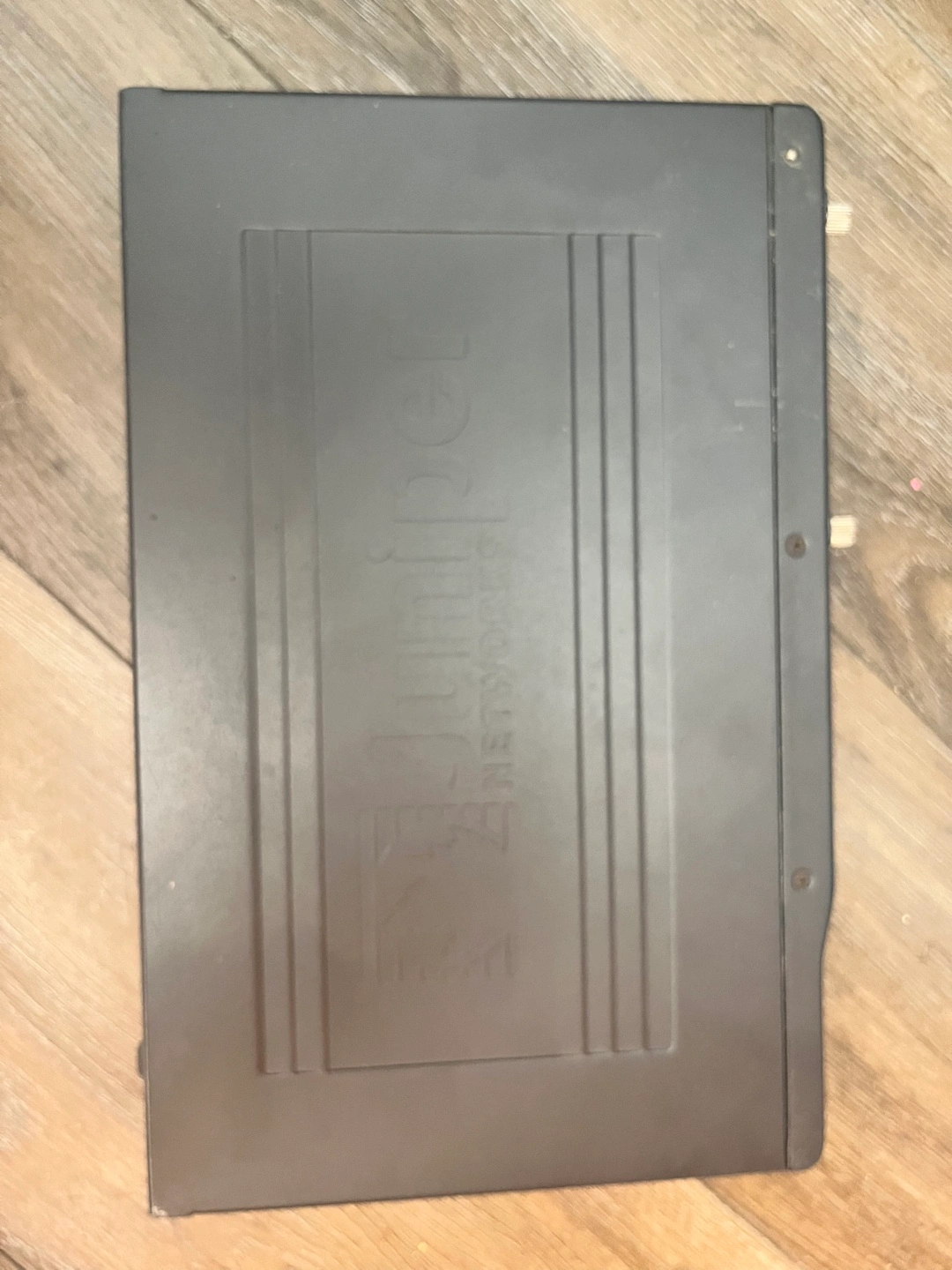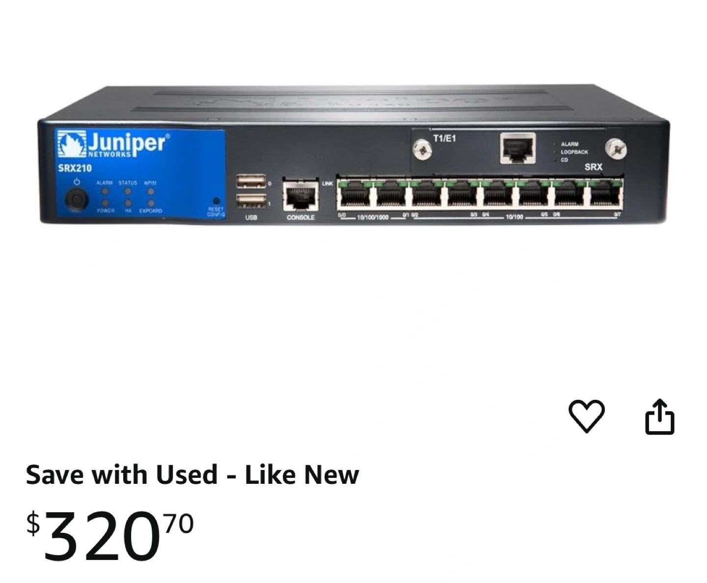 Used Juniper Networks SRX210 Services Gateway. Includes multiple ports and slots. Good working condition. See photos for details.