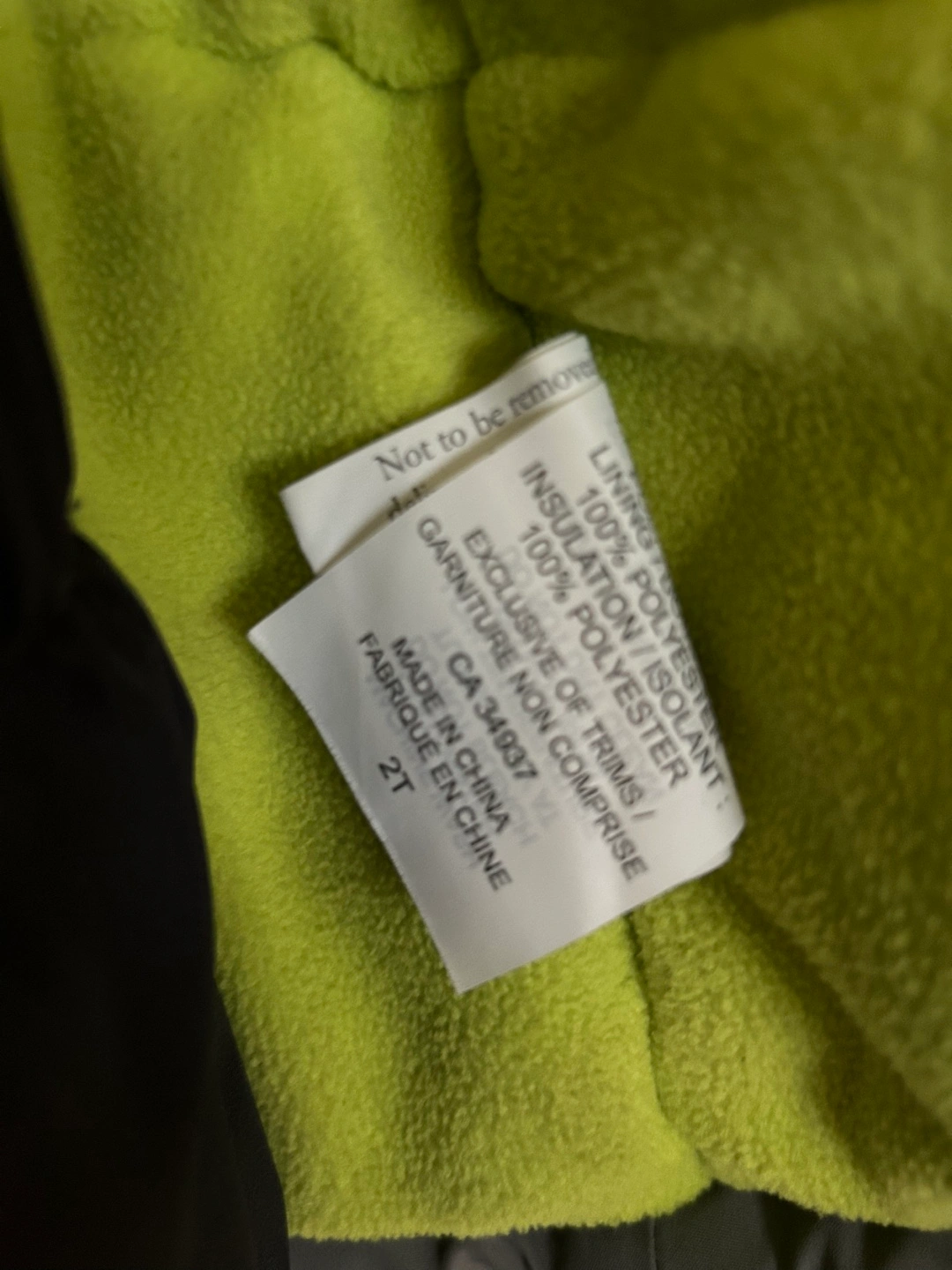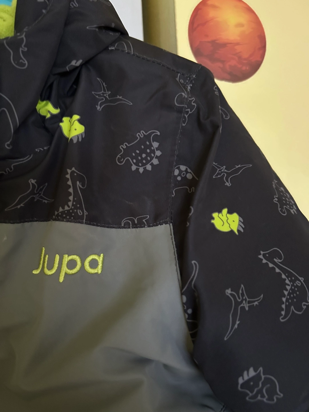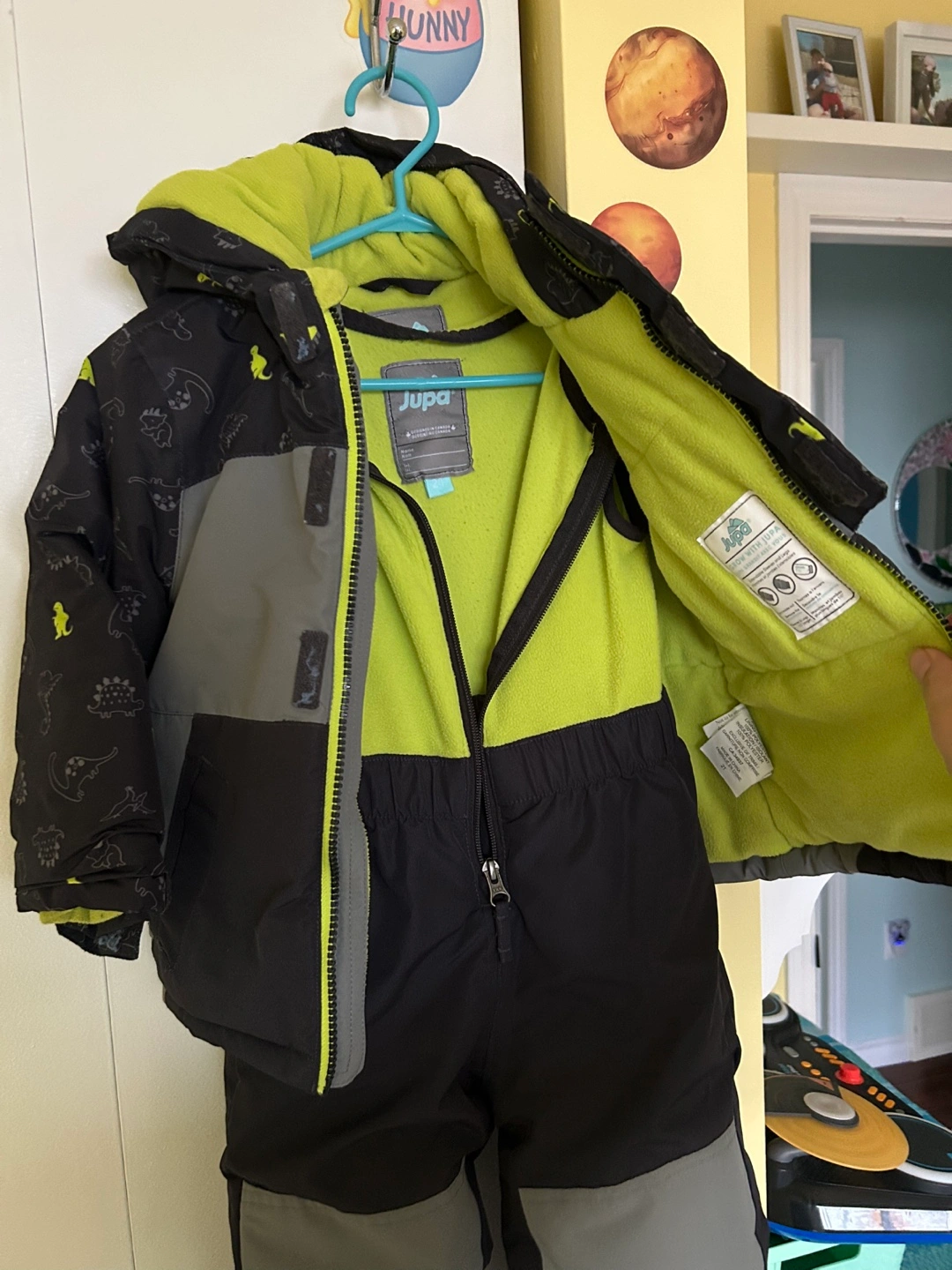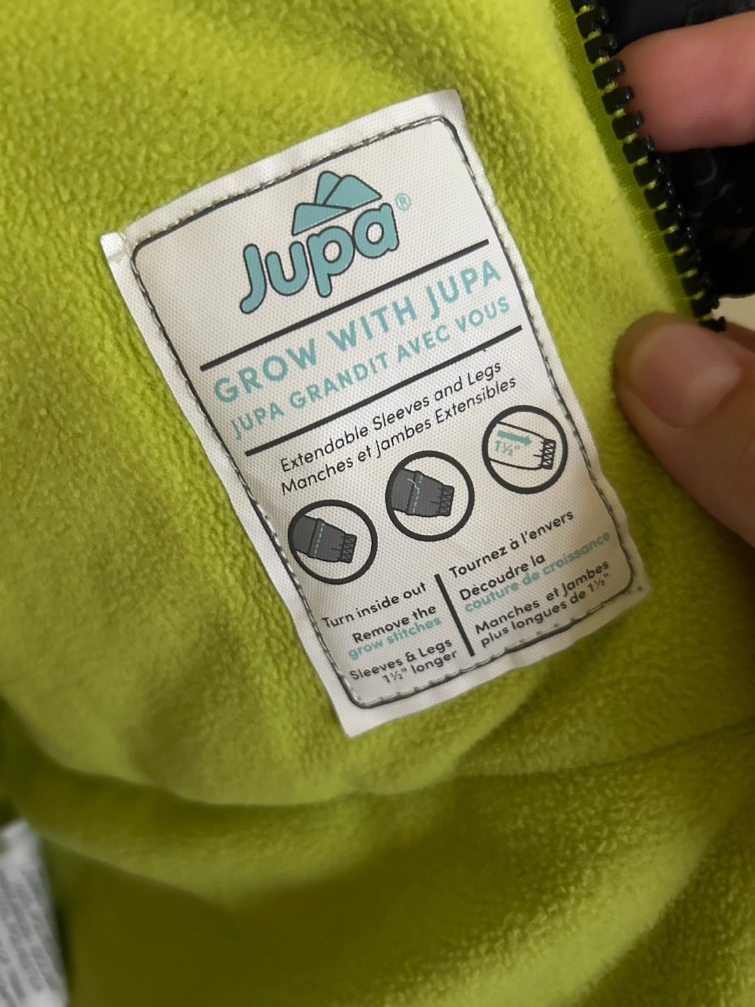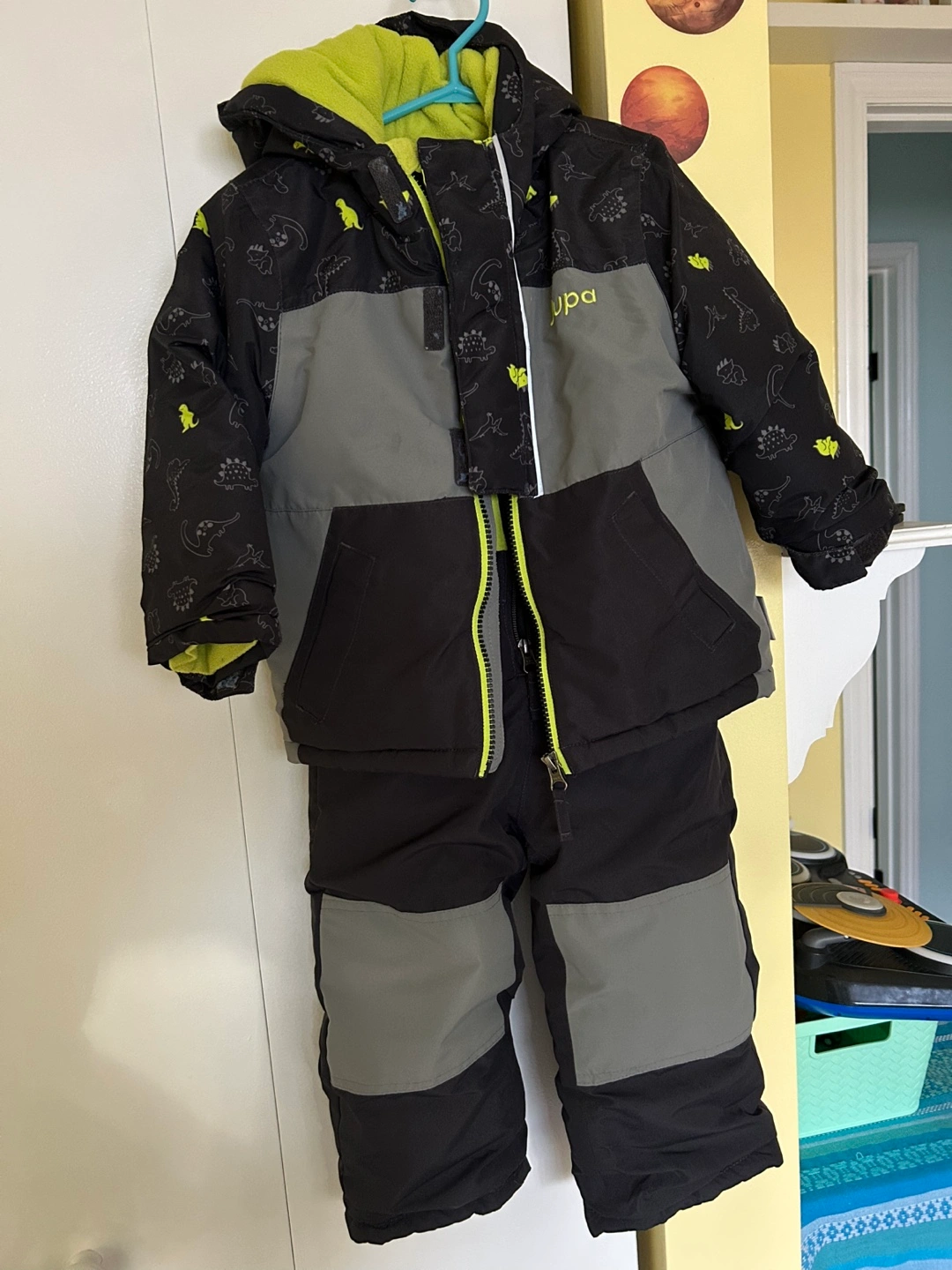 Jupa snowsuit in size 2T. It features a fun dino pattern and has extendable sleeves and legs for a longer fit. Perfect for keeping your little one warm this winter