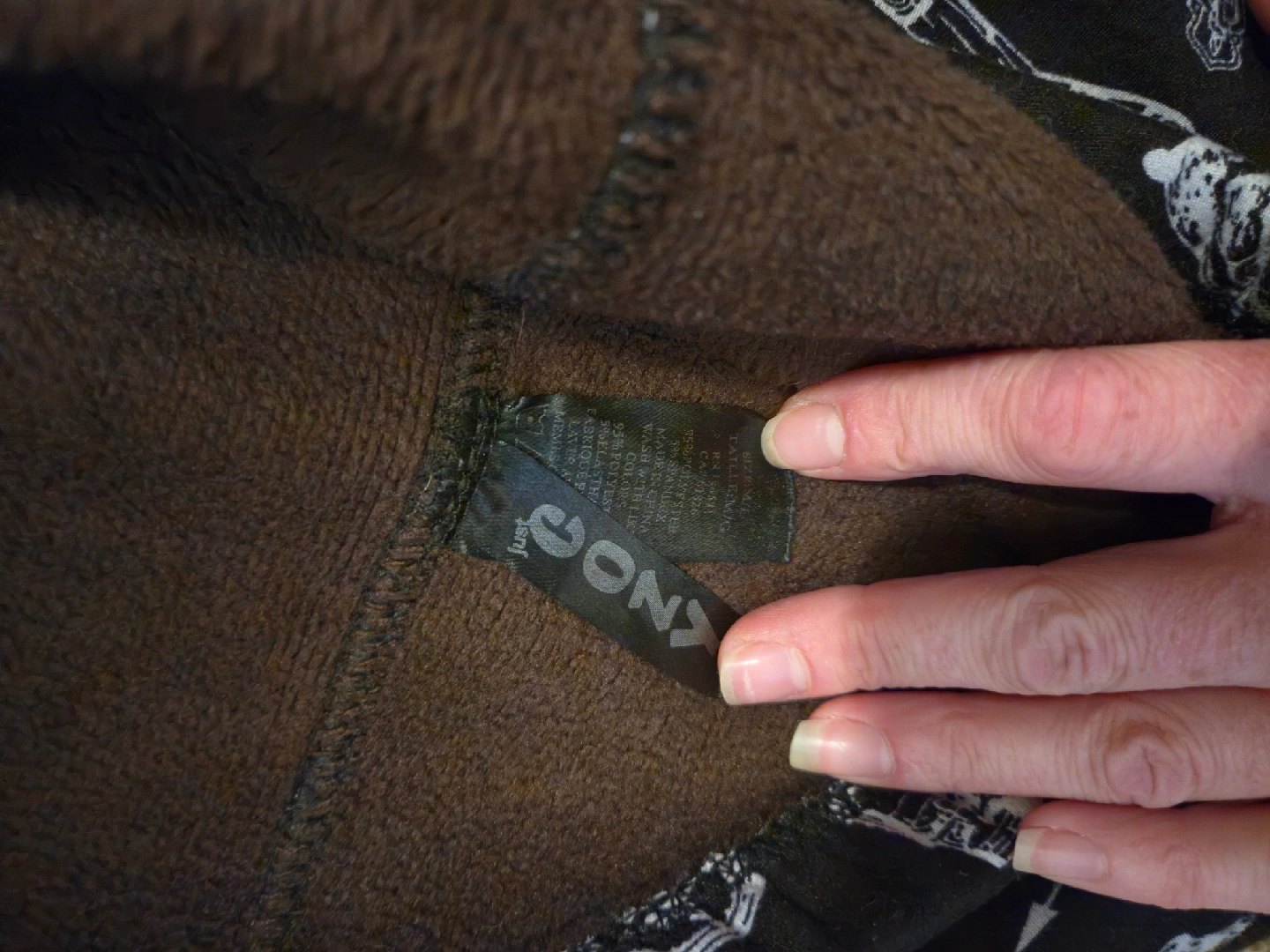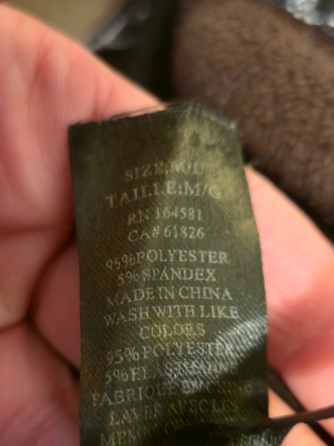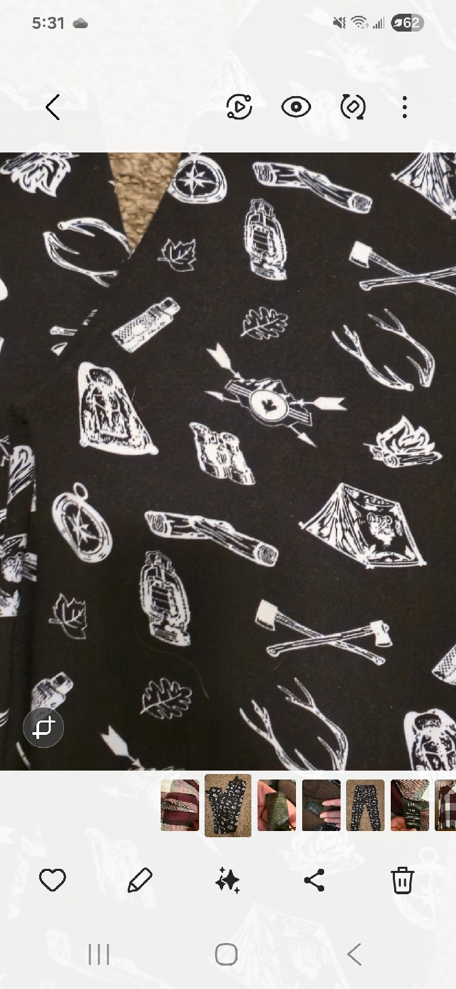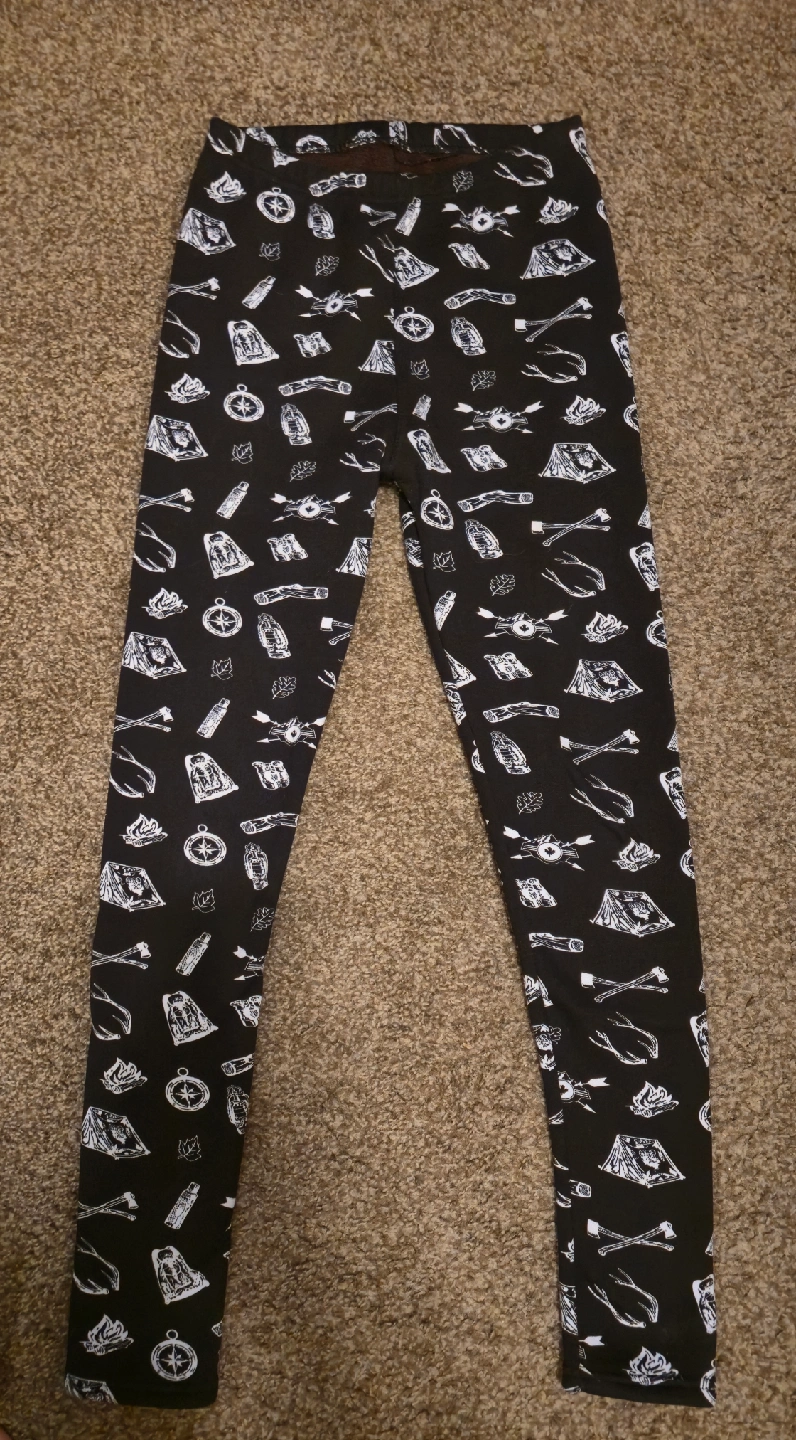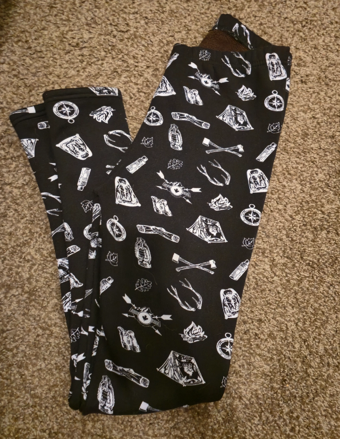 I'm selling a pair of Just Cozy leggings in size medium. They're black with a fun camping-themed pattern. The material is 95% polyester and 5% spandex, so they're nice and stretchy & warm (flannel).