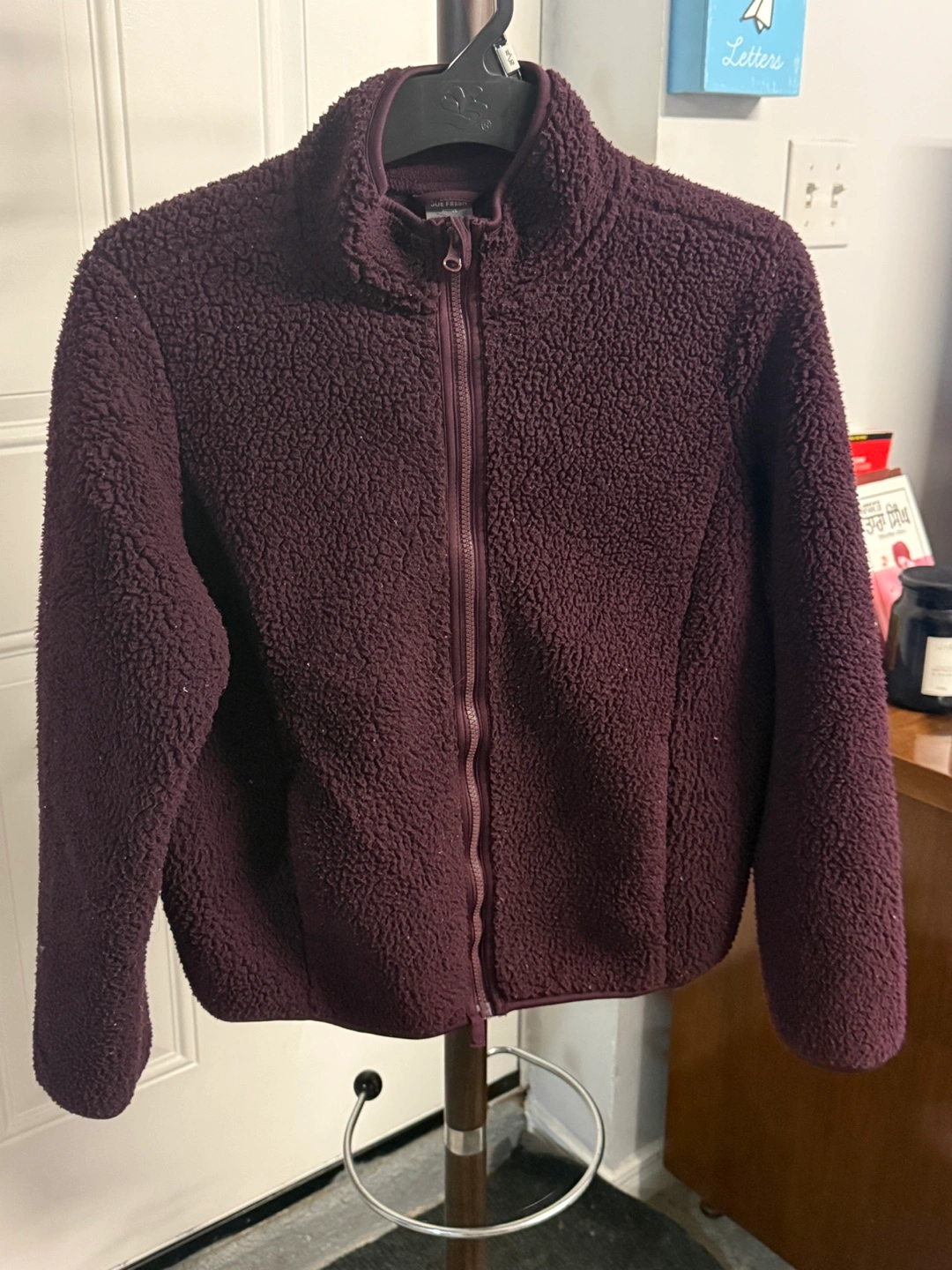 Here's a cozy burgundy fleece jacket from Joe Fresh! It's perfect for layering or wearing on its own during cooler weather. The fleece material is soft and comfortable, making it a great addition to your wardrobe