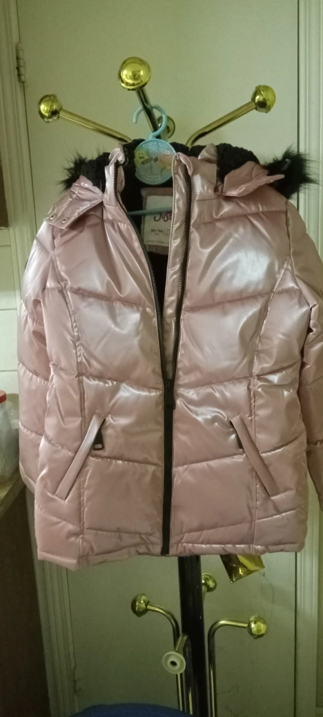 Pink puffer jacket with faux fur hood and a zipper closure. Has a Justice logo patch on the sleeves.no rips no stains in excellent condition if interested plz msg me for the price or send me your offer thankyou an advance price is confirm