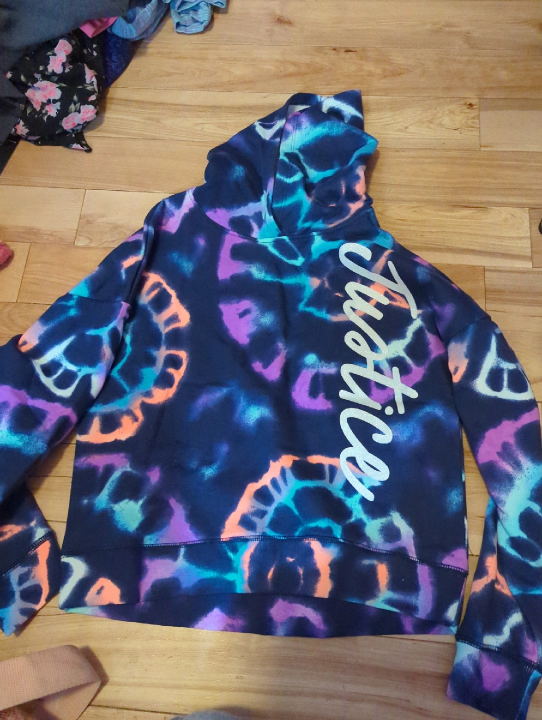 Tie dye hoodie with Justice logo on the side. Great for layering or wearing on its own