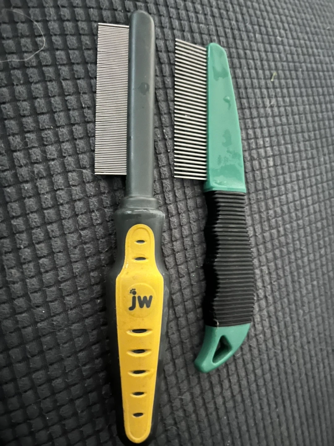Selling a set of two dog grooming combs. One is a JW Pet comb with a yellow handle, and the other has a green handle. Great for keeping your furry friend looking their best!