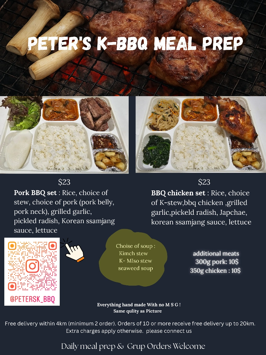 Korean BBQ Bento by Michelin-Experienced Chef ๐ฑ๐ฅ Tired of spending $100+ at K-BBQ restaurants for one meal? Now you can enjoy the same authentic flavors at home for a fraction of the price! Each Bento Box includes 5 homemade Korean dishes + 200g premium grilled meat, prepared fresh by a chef with years of fine dining experience. โ๏ธ Same quality as dining out โ delivered to you โ๏ธ Freshly grilled on BBQ (no shortcuts!) โ๏ธ Perfect for lunch, dinner, or group orders We also offer additional side dishes โ just ask! ๐ฉ Message me for more details or to place your order. Your taste buds will thank you! ๐ *Delivery can extra charge depending on distance *(more then 4 order no delivery fee) --- โจ ๋ฏธ์๋ญ ๊ฒฝ๋ ฅ ์ ฐํ๊ฐ ๋ง๋๋ K-BBQ ๋ฐ์น๋ฐ์ค ๐ฑ๐ฅ ๋ฐ์์ K-BBQ ๋จน์ผ๋ ค๋ฉด 1์ธ๋น $100 ์ด์โฆ ๋ถ๋ด๋์ง ์์ผ์ธ์? ์ด์ ๋ ์ง์์ ํฉ๋ฆฌ์ ์ธ ๊ฐ๊ฒฉ์ผ๋ก ์ ฐํ์ ์ง์ง ๋ฐ๋ฒ ํ ๋ง์ ์ฆ๊ธฐ์ธ์! โ๏ธ ๊ณ ๊ธฐ 200g + ์ง์ ๋ง๋ ํ๊ตญ ๋ฐ์ฐฌ 5์ข โ๏ธ BBQ ๊ทธ๋ฆด๋ก ์ ์ฑ๊ป ๊ตฌ์๋ธ ๊ณ ๊ธฐ โ๏ธ ์ง์์๋ ๋ ์คํ ๋ ํ๋ฆฌํฐ ๊ทธ๋๋ก ์ถ๊ฐ ๋ฐ์ฐฌ ์ฃผ๋ฌธ & ๋จ์ฒด ์ฃผ๋ฌธ๋ ํ์ํฉ๋๋ค! ๐ฉ ๊ถ๊ธํ ์ ์ด๋ ์ฃผ๋ฌธ ์ํ์๋ฉด ๋ฉ์์ง ์ฃผ์ธ์.