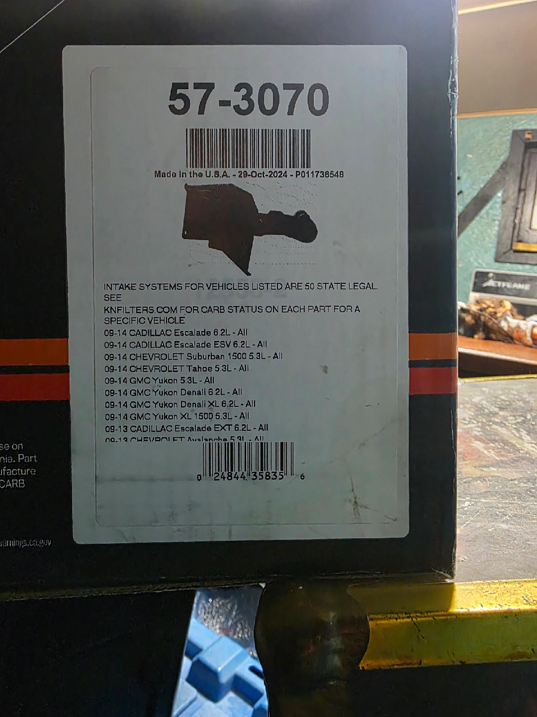 Selling a brand new K&N 57-3070 air intake system! It's still in the original box and includes all the components and instructions. This system fits a variety of vehicles, including: - 09-14 Cadillac Escalade 6.2L - 09-14 Cadillac Escalade ESV 6.2L - 09-14 Chevrolet Suburban 1500 5.3L - 09-14 Chevrolet Tahoe 5.3L - 09-14 GMC Yukon 5.3L - 09-14 GMC Yukon Denali 6.2L - 09-14 GMC Yukon XL 1500 5.3L - 09-14 Cadillac Escalade EXT 6.2L - 09-13 Chevrolet Avalanche 5.3L Check the K&N website to confirm compatibility with your specific vehicle!