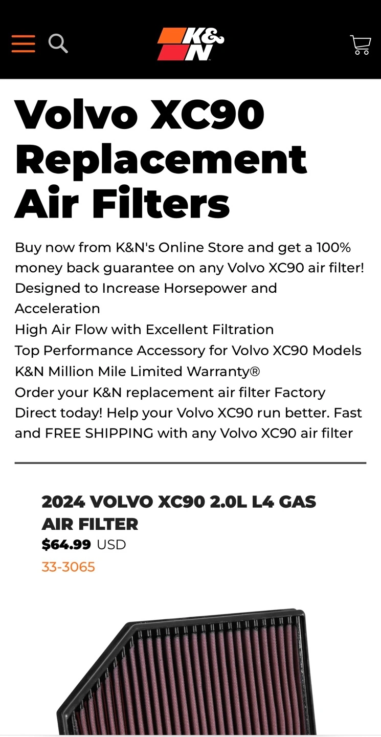 ๐จ๐ฆ K&N Engine Air Filter for Volvo XC90 2015-2025