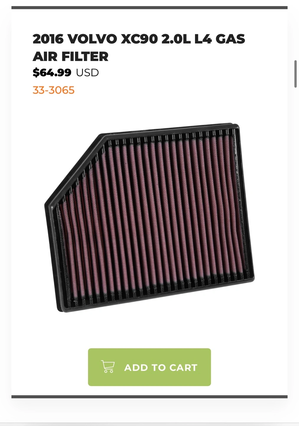 K&N replacement air filter for Volvo XC90. High performance, excellent filtration. Designed to increase horsepower and acceleration. Washable and reusable. Up to 75,000 miles between cleanings. Includes instructions.