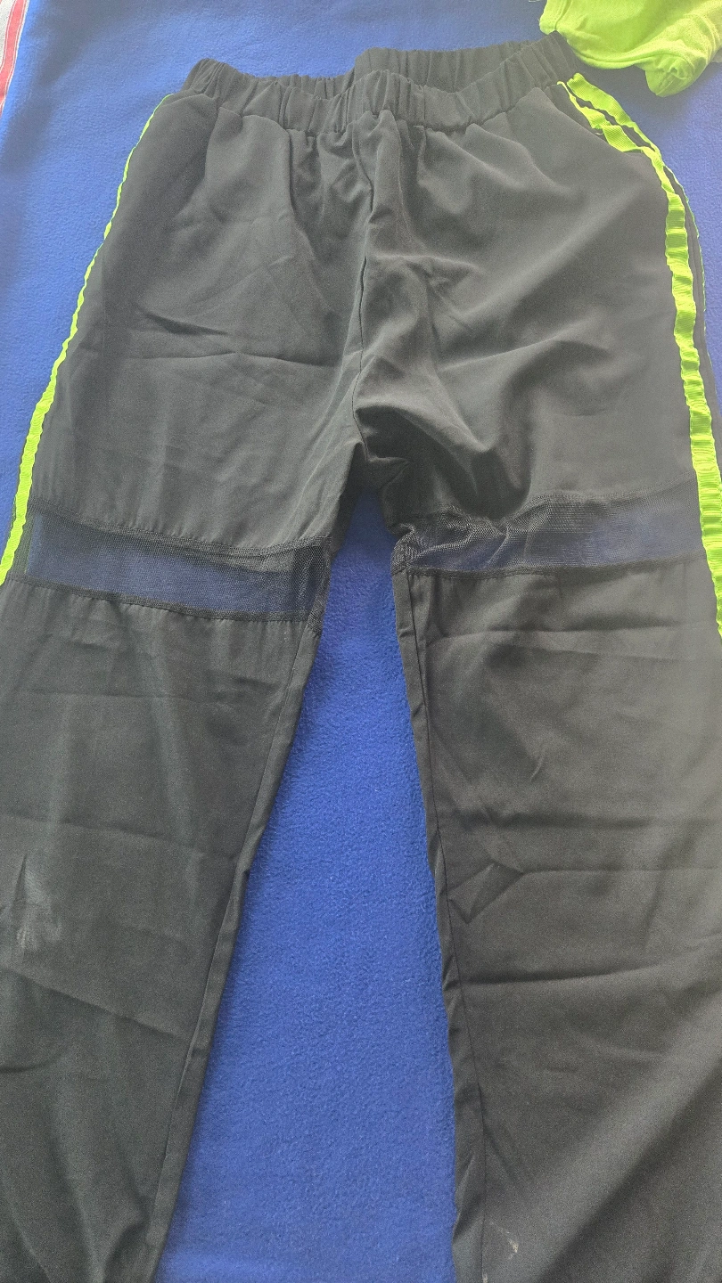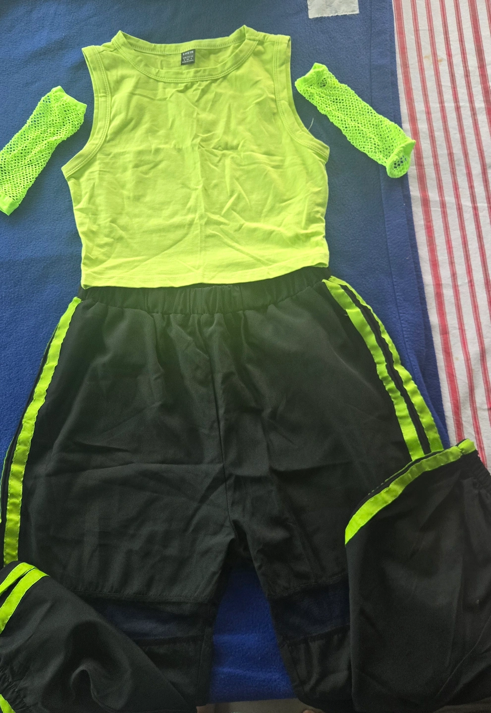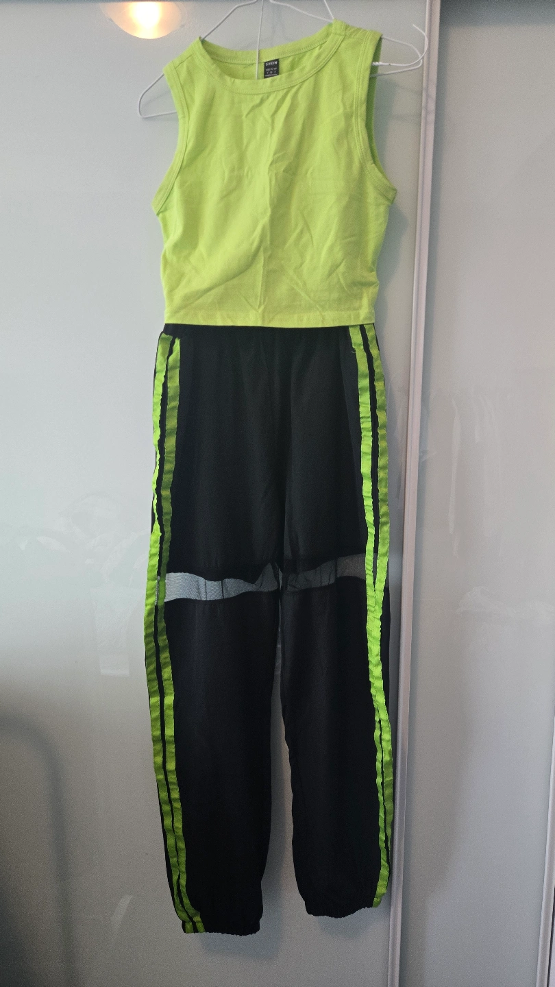 Bright lime green crop top and black pants. Includes mesh arm warmers. Size small. Great for dance or casual wear.