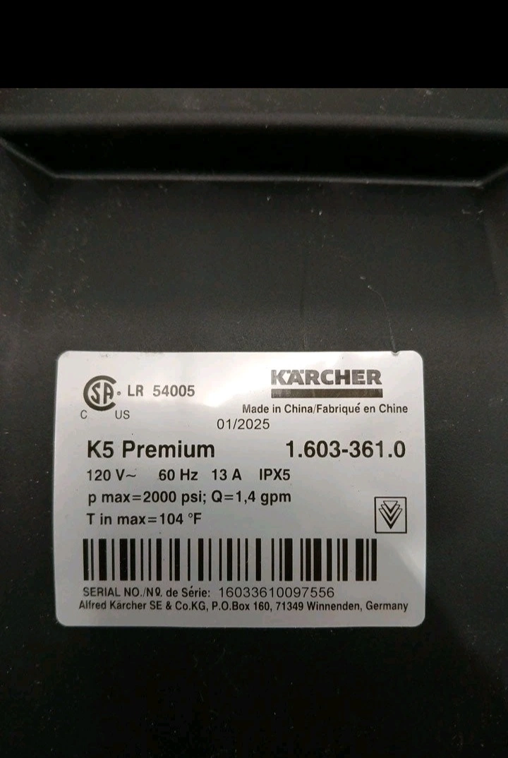 Selling a Kärcher K5 Premium pressure washer. It's in great shape and ready to tackle your outdoor cleaning tasks! Operates at 120V, 60 Hz, and 13 A. Produces a maximum pressure of 2000 psi with a flow rate of 1.4 gpm. Maximum inlet temperature is 104°F. Includes all the accessories shown in the pictures!