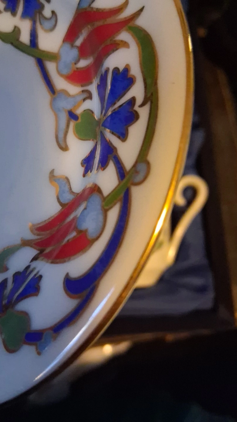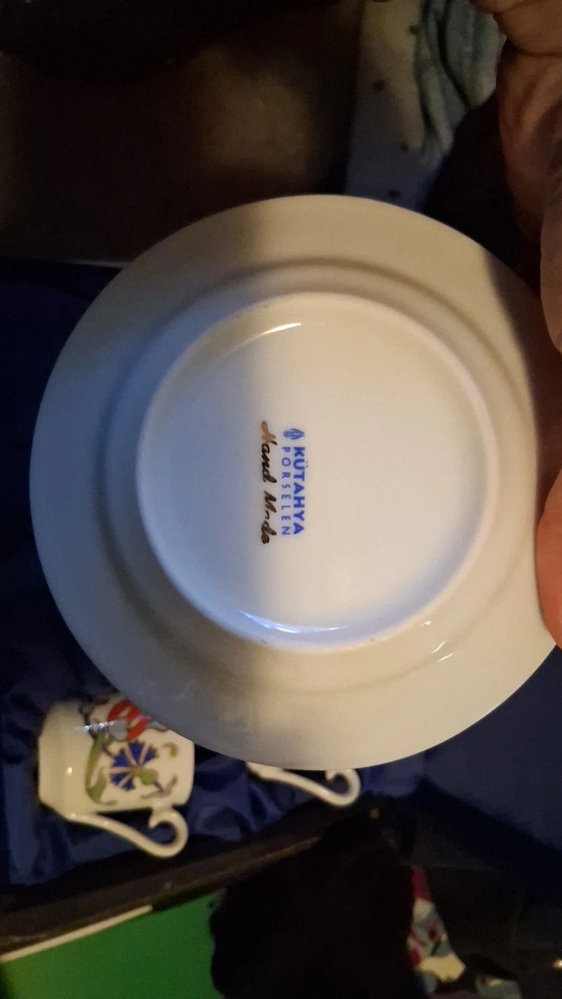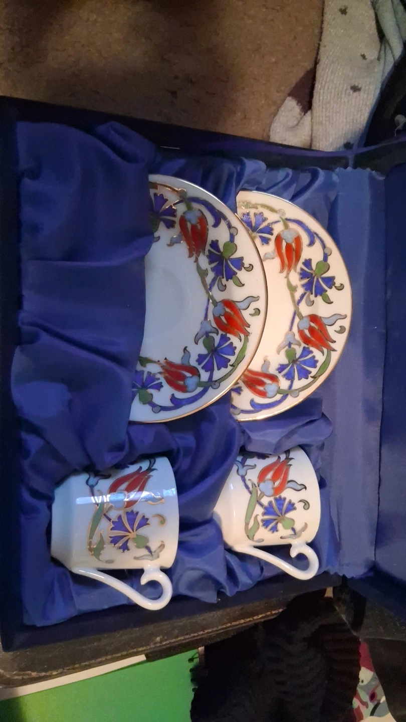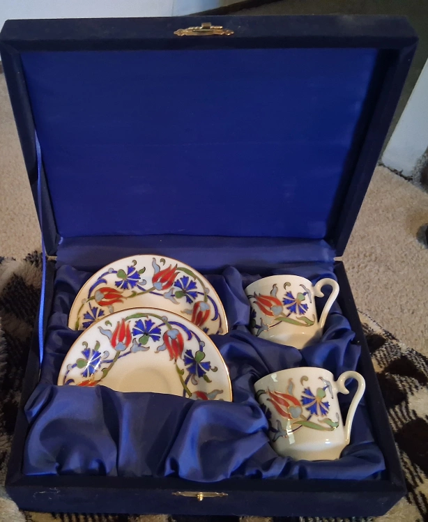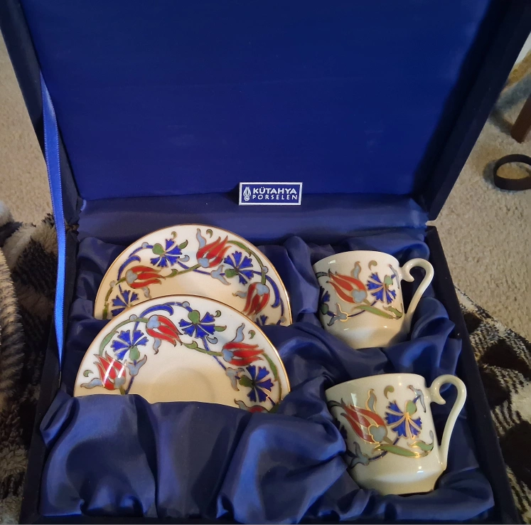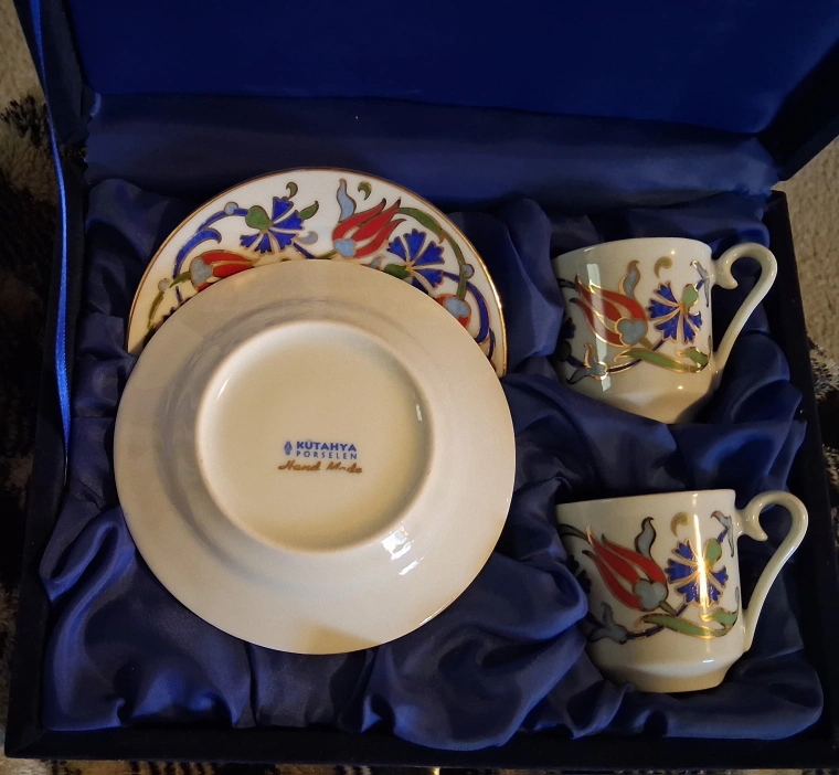 Selling a beautiful Kütahya Porcelain Turkish coffee set. This handmade set includes two cups and two saucers, all nestled in a lovely blue box. The cups and saucers feature a delicate tulip and floral design with gold accents. Perfect for enjoying a traditional Turkish coffee experience!
