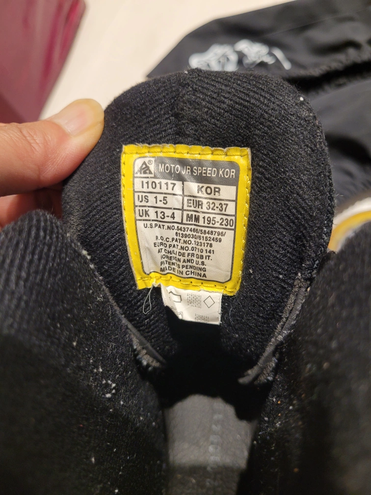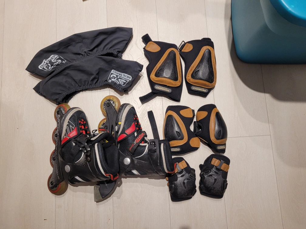 Selling a pair of ADJUSTIBLE K2 Moto JR Speed inline roller skates. They are black with red accents and come with protective gear. The size is US 1-5, EUR 32-37.