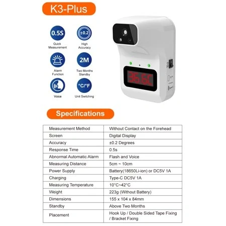 K3 Plus Infrared Thermometer, Wall Mounted Non Contact Digital Forehead Temp
