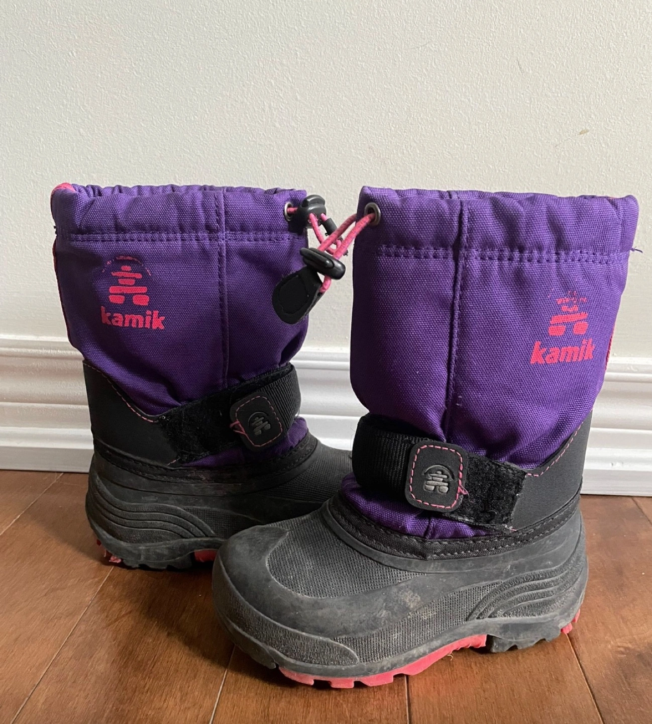 Toddler Size 9 Kamik winter boots. Purple fabric upper, black soles. Drawstring closure at top. Velcro straps. Pink accents. Cash Pick up Aurora Walmart or 16th and woodbine SportChek.