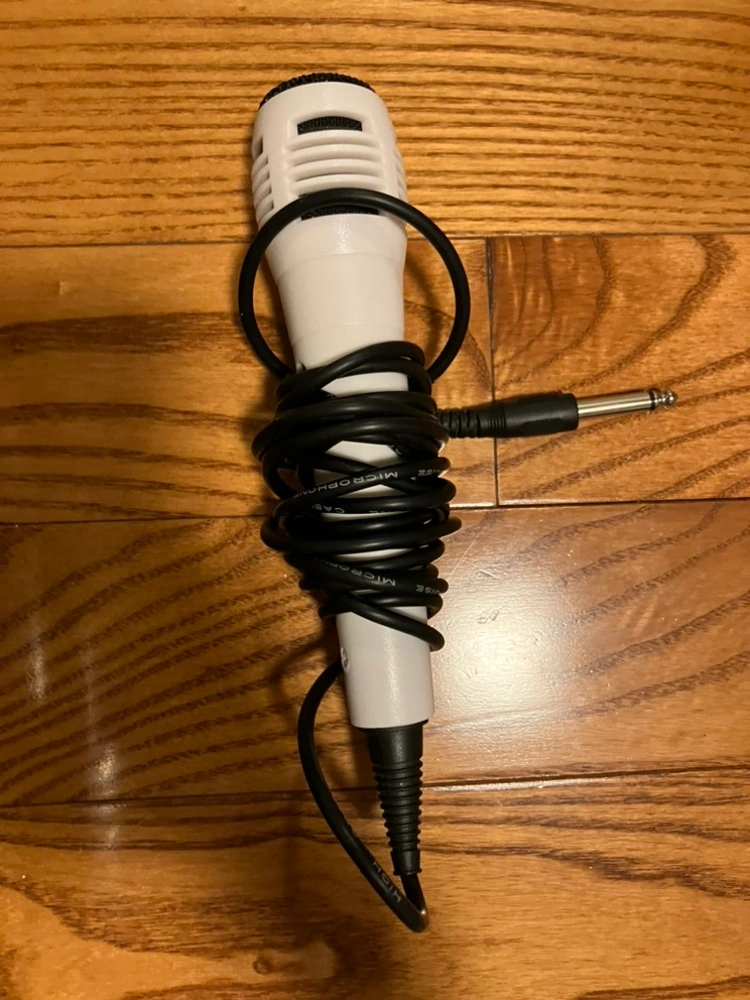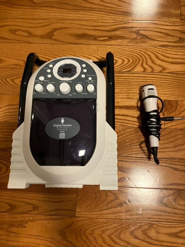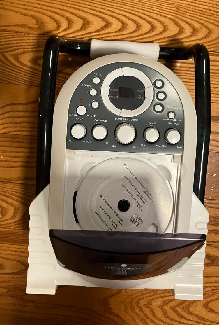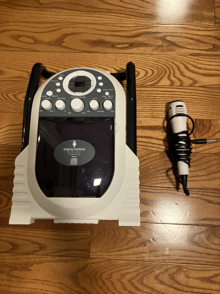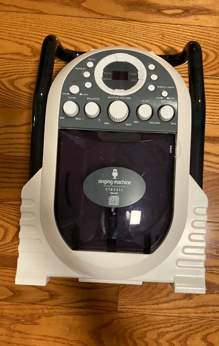 This is a karaoke machine that comes with a microphone. It has a CD player with features for controlling the sound. It includes a carrying handle and a disco light. It does not include any CDs.