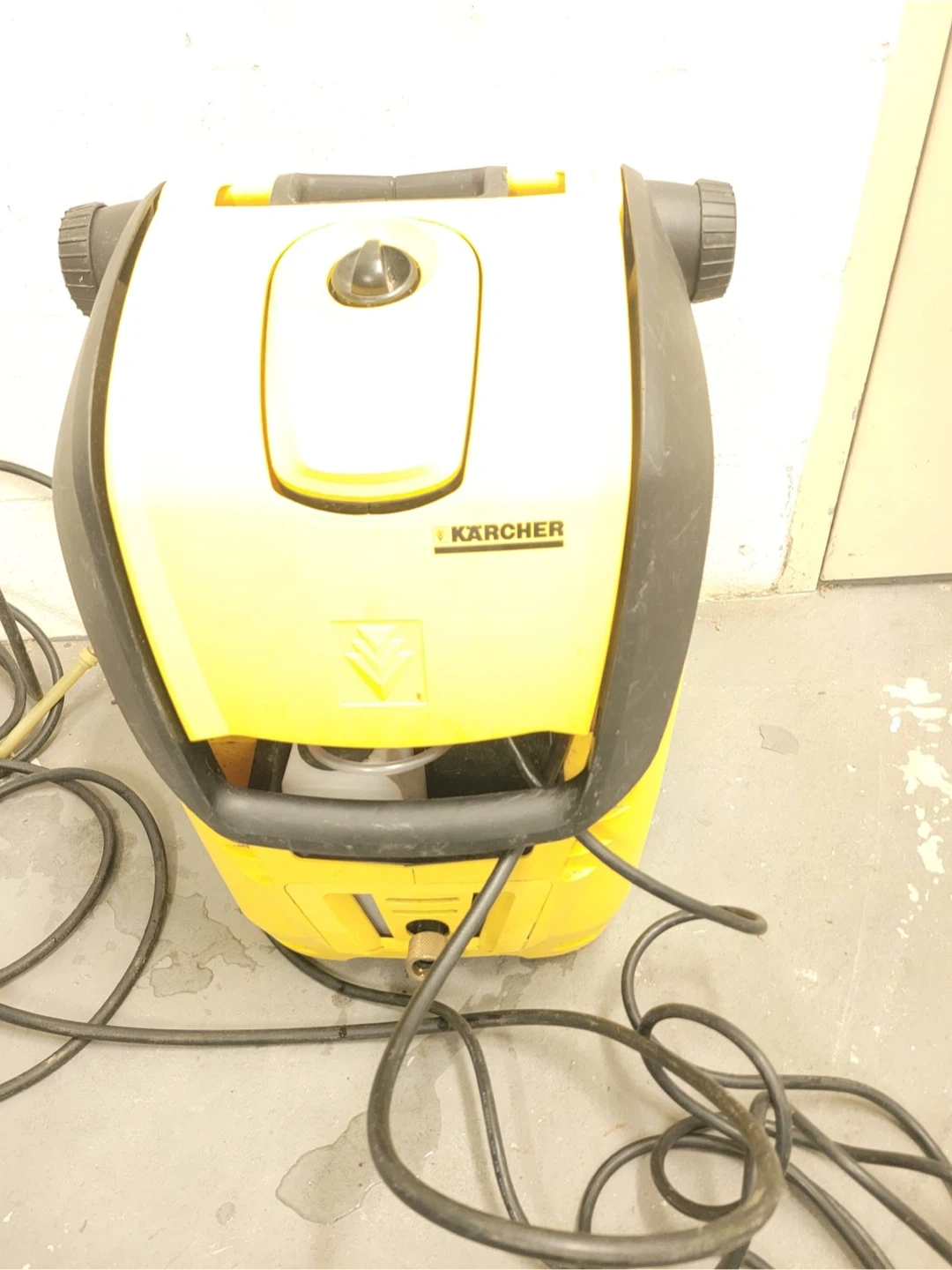 Selling a Karcher K3.96M pressure washer. It's in used condition and has some scratches on the yellow plastic body. The model number is 1.636-104. It operates at 120V, 1Ph, 60Hz, with a maximum pressure of 1750psi and a flow rate of 1.5gpm