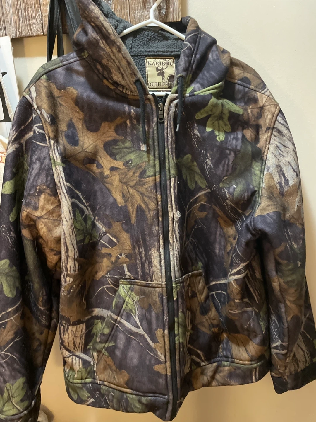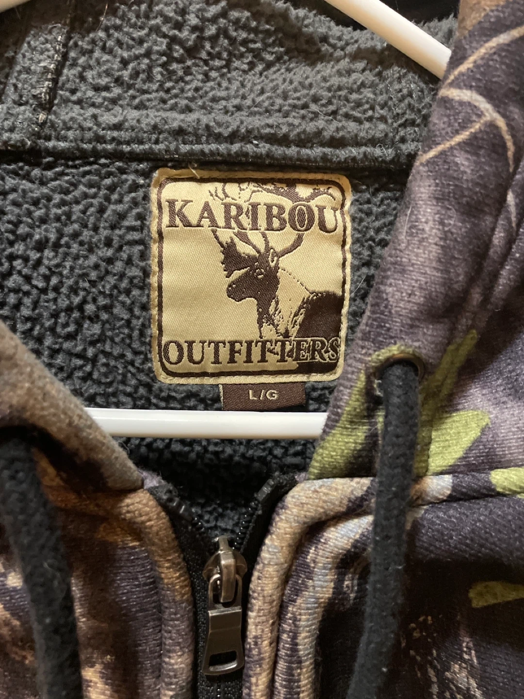 Cozy up in this Karibou Outfitters fleece hoodie! It features a cool camouflage pattern and a super soft fleece lining. Perfect for staying warm on chilly days. Size is L/G
