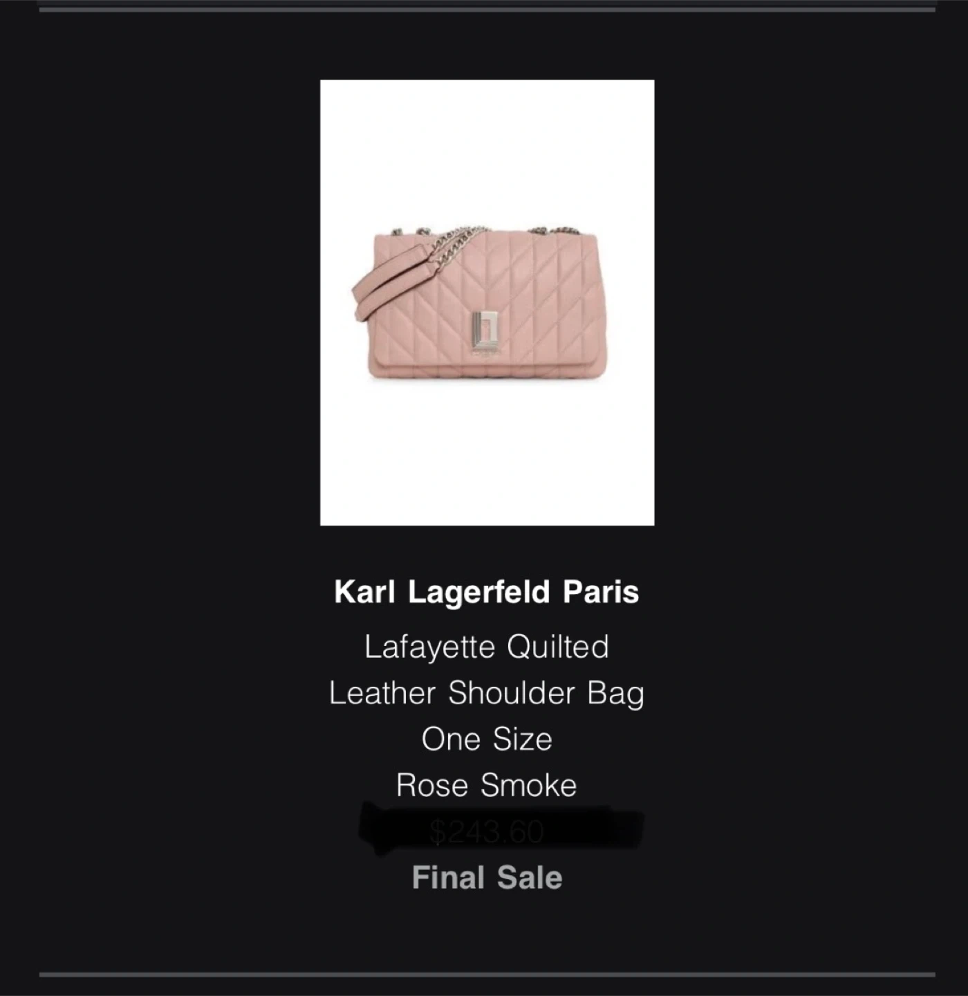 Selling a brand new with tag, Karl Lagerfeld Paris Lafayette Quilted Leather Shoulder Bag in Rose Smoke. It's in perfect condition and still has all the original packaging. It's a beautiful bag and ready for a new home, purchased from Bay website in 2024 and never used. Did not come with a dust bag.