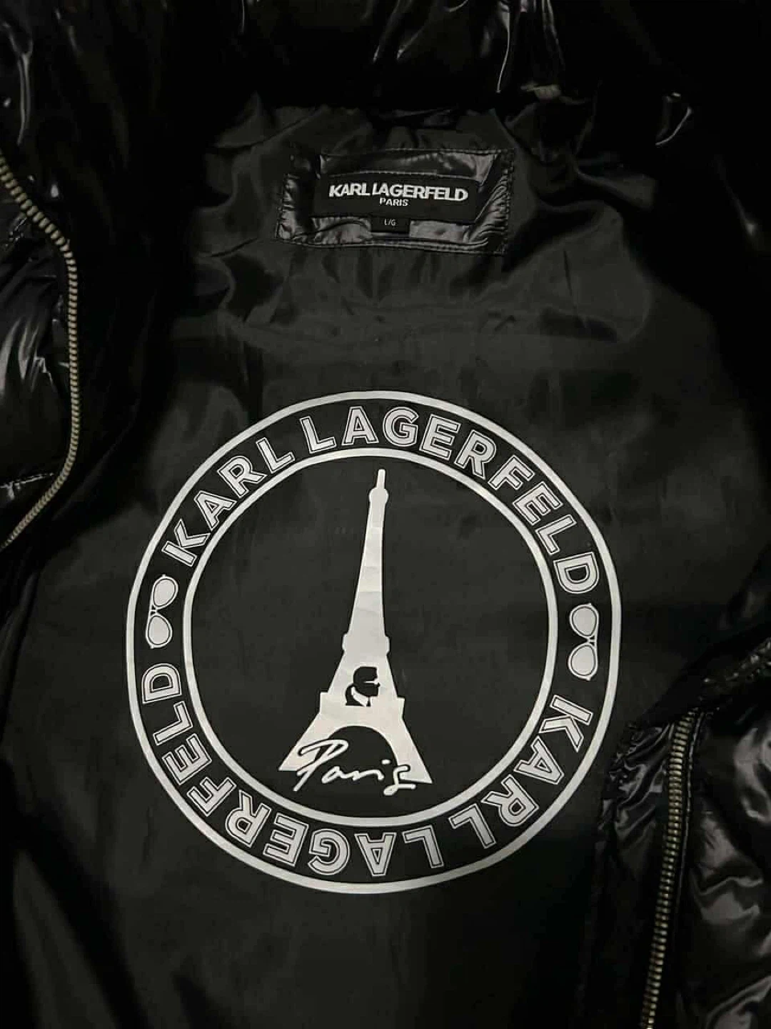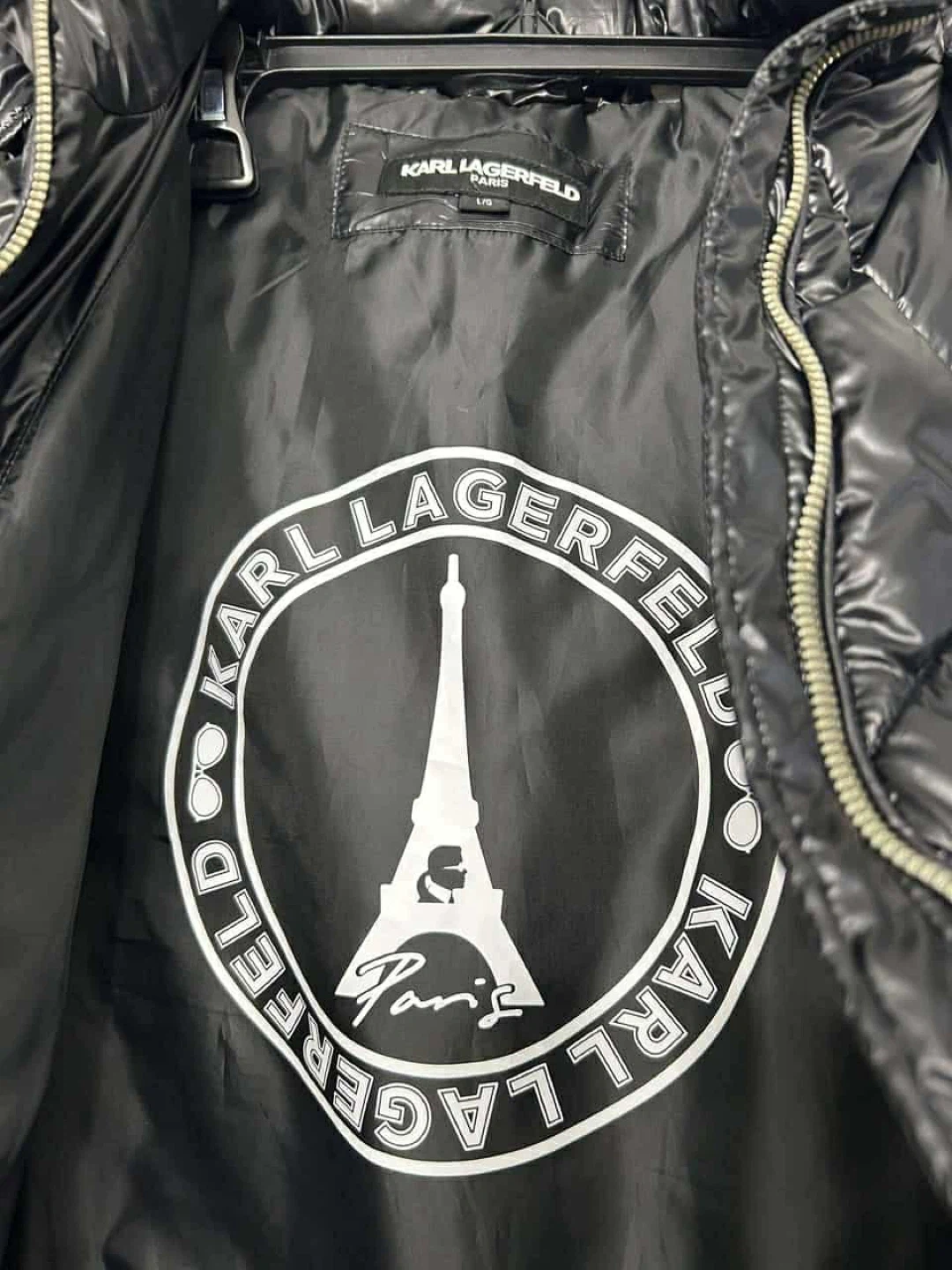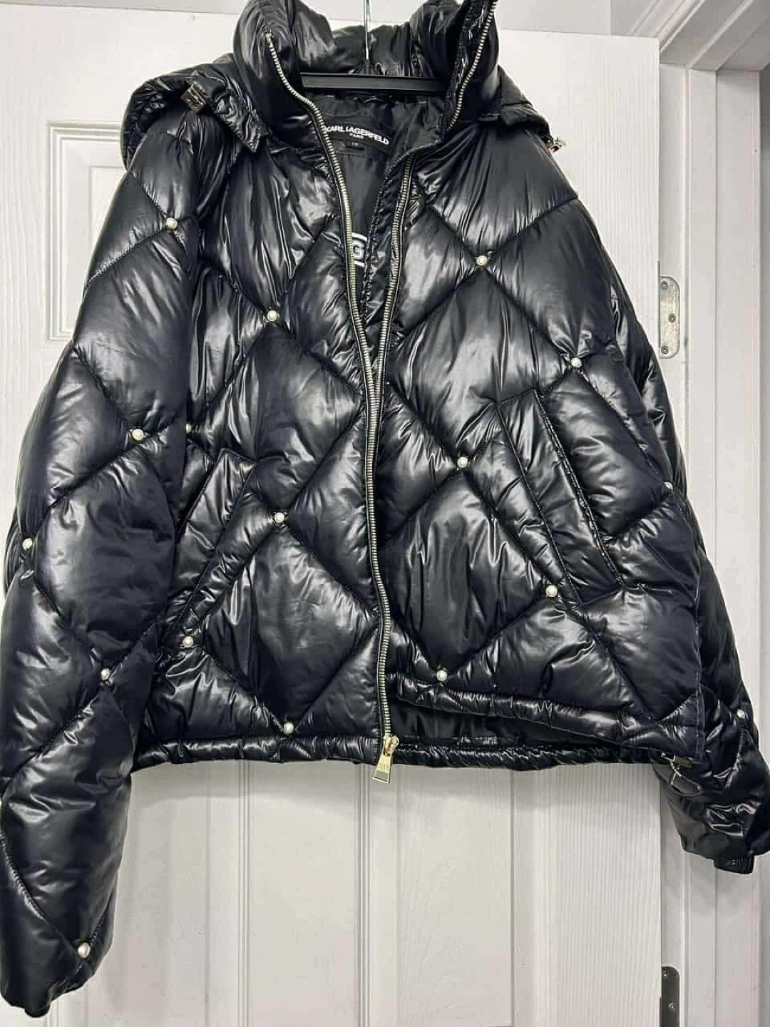 Selling a Karl Lagerfeld Paris black puffer jacket. It's a size L/G. The jacket has a unique quilted design with pearl-like accents. Great for staying warm and stylish!