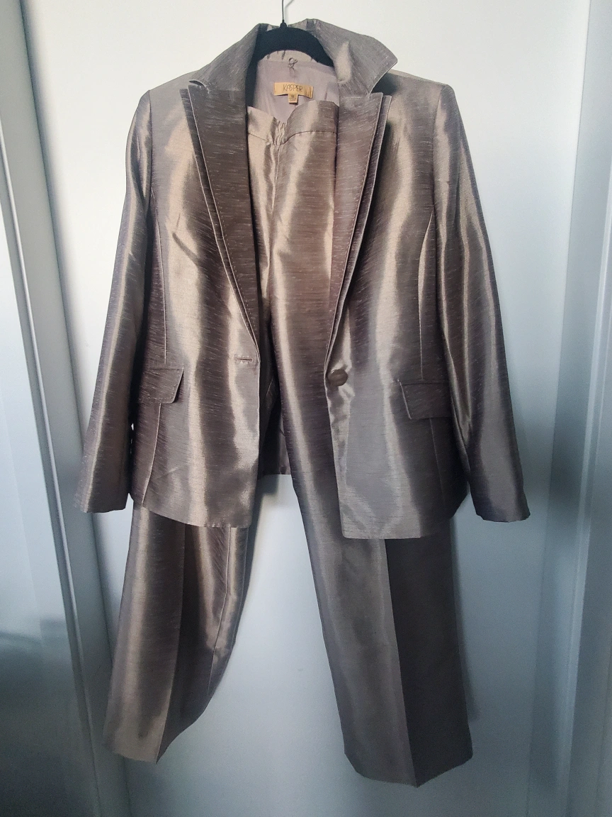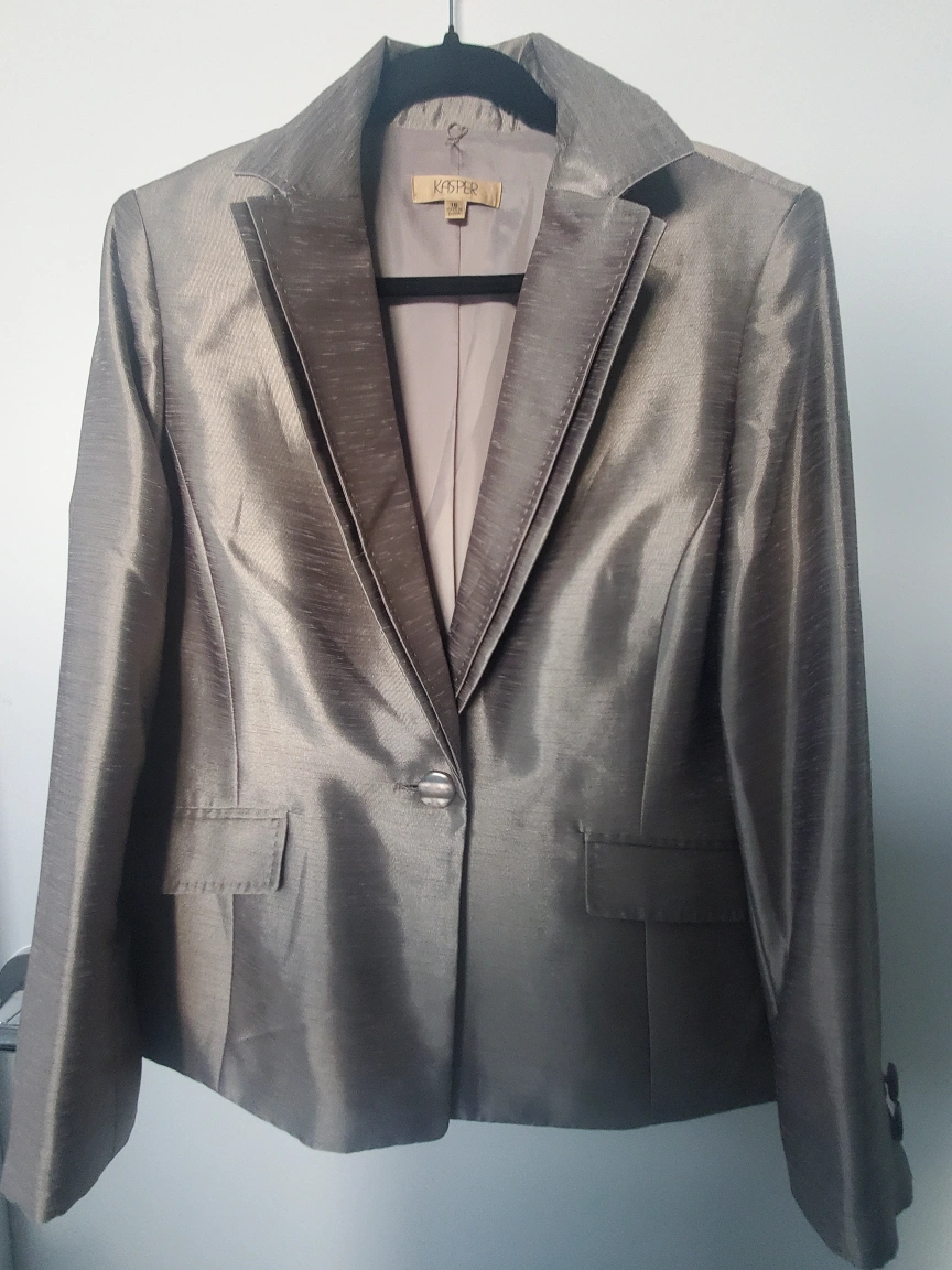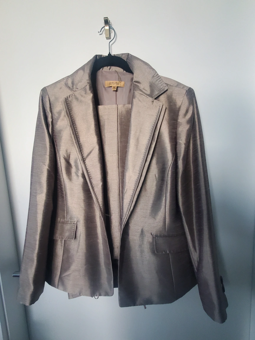 Selling a brand new Kasper women's pant suit set in size 16! This elegant set includes a blazer and pants, perfect for professional or formal occasions. The colour is a beautiful, shimmering taupe. It's in great condition and ready for a new home! Cash and Pick up Only Please!