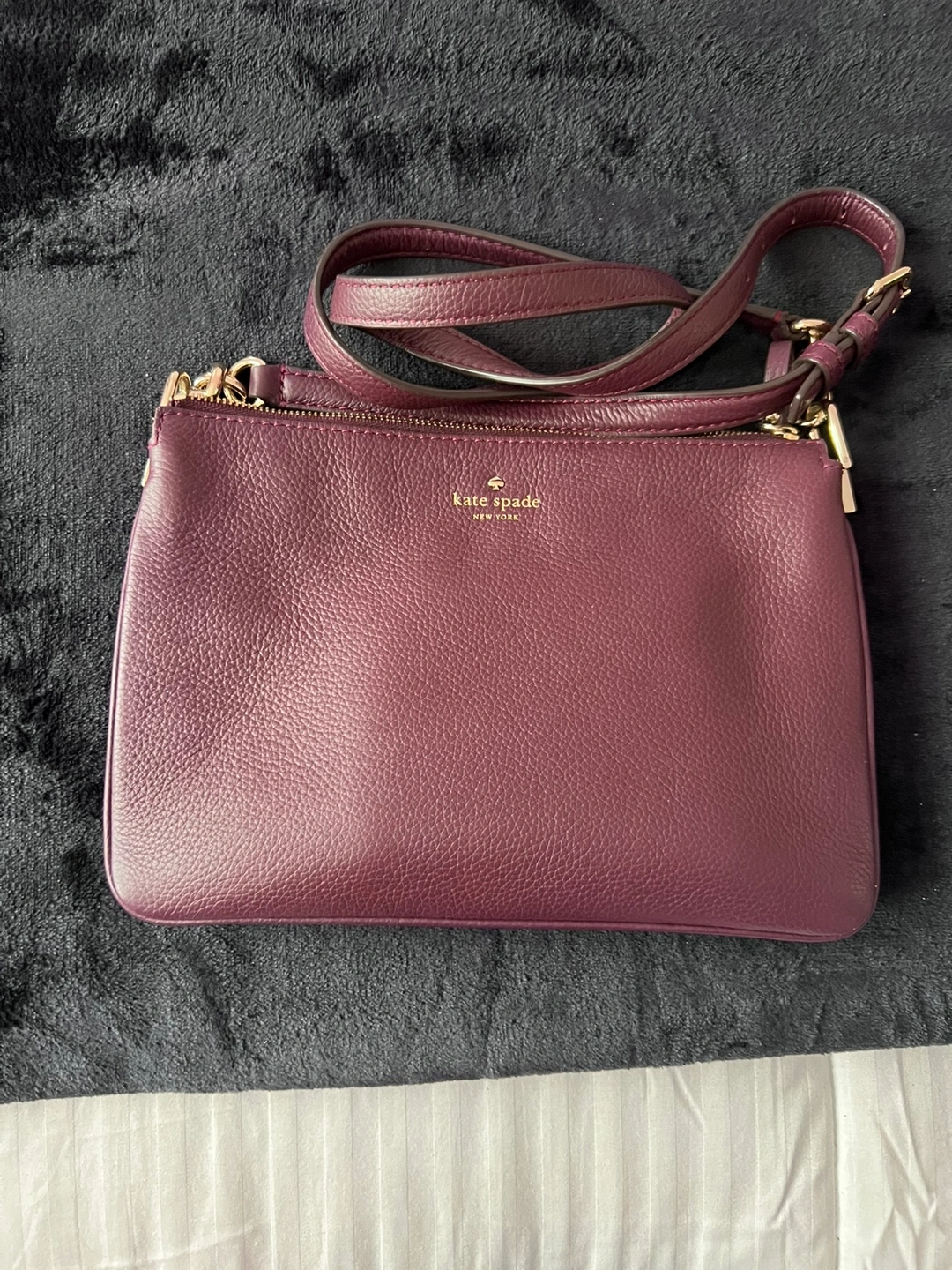 Purple leather crossbody bag with a long strap. Has multiple interior pockets and a zipper closure. Used once wasn’t really my colour!