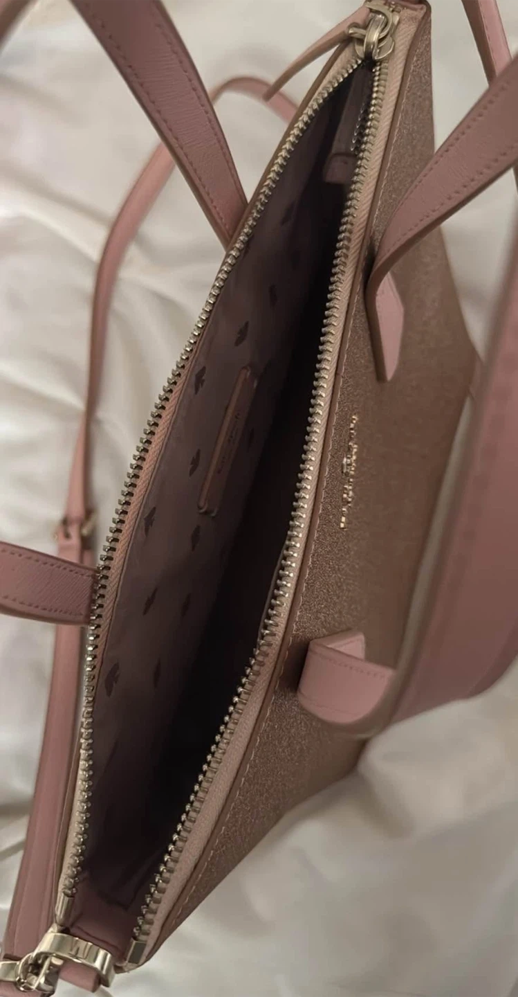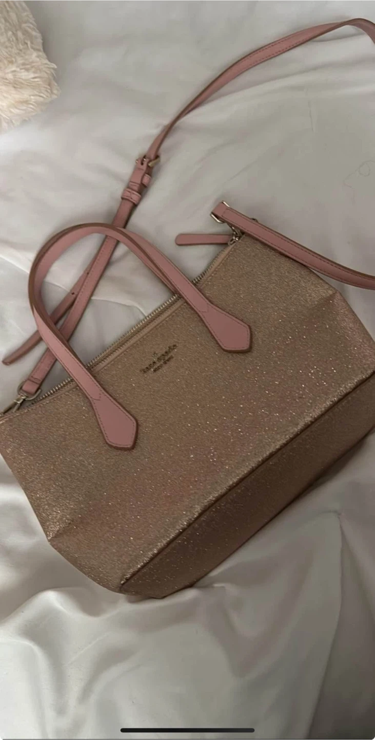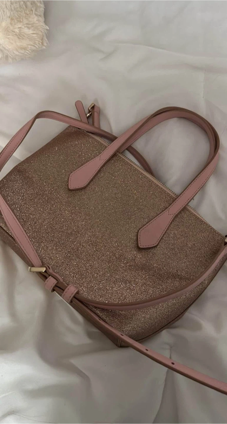 Selling a Kate Spade purse with a glittery exterior and pink straps. It's in great condition and perfect for adding a bit of sparkle to your outfit! The inside has a cute Kate Spade logo pattern.