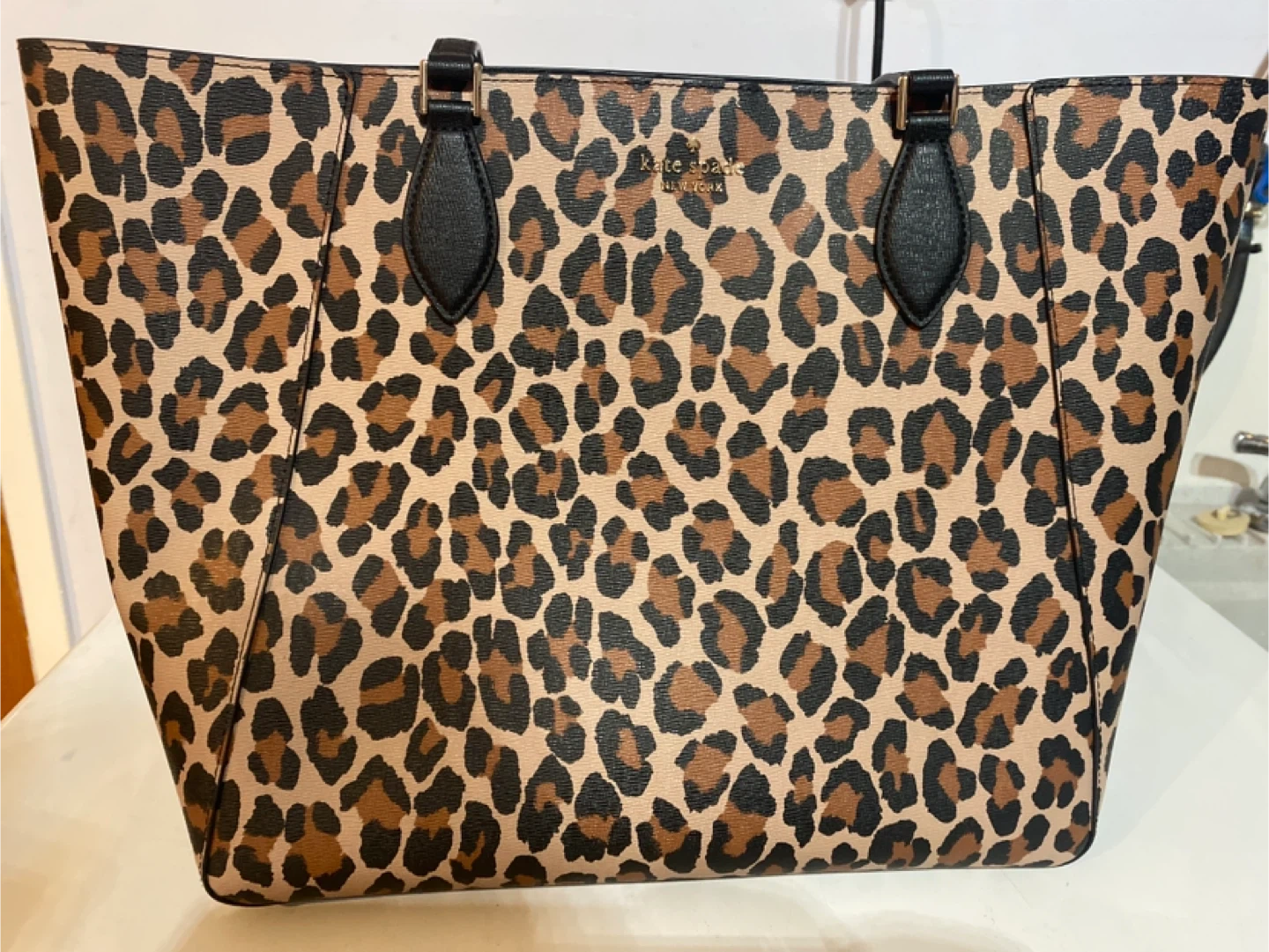 Selling a Kate Spade tote bag with a fun leopard print! It's in great condition and perfect for carrying your everyday essentials. The bag features black leather accents on the handles. A stylish addition to any outfit!