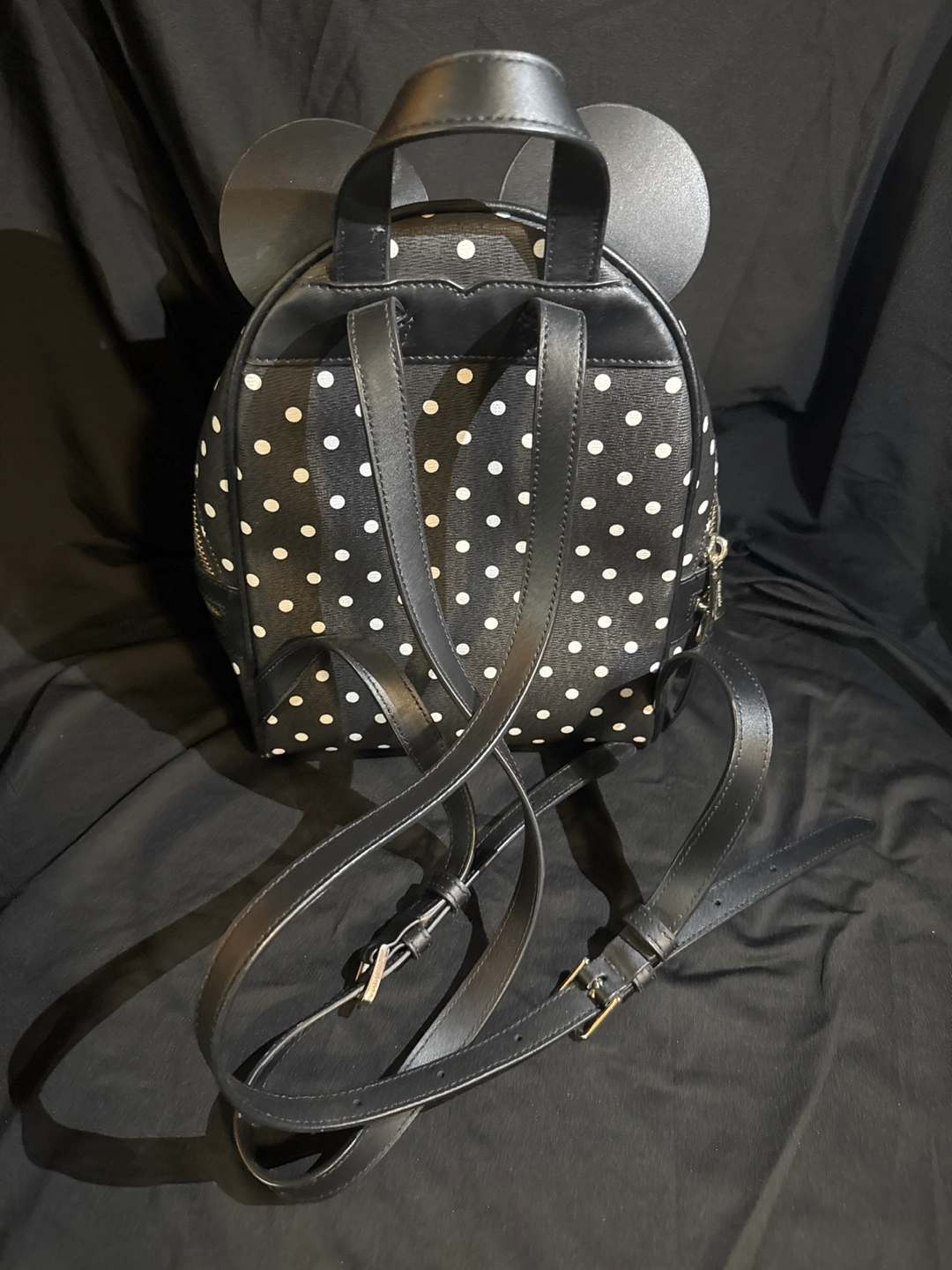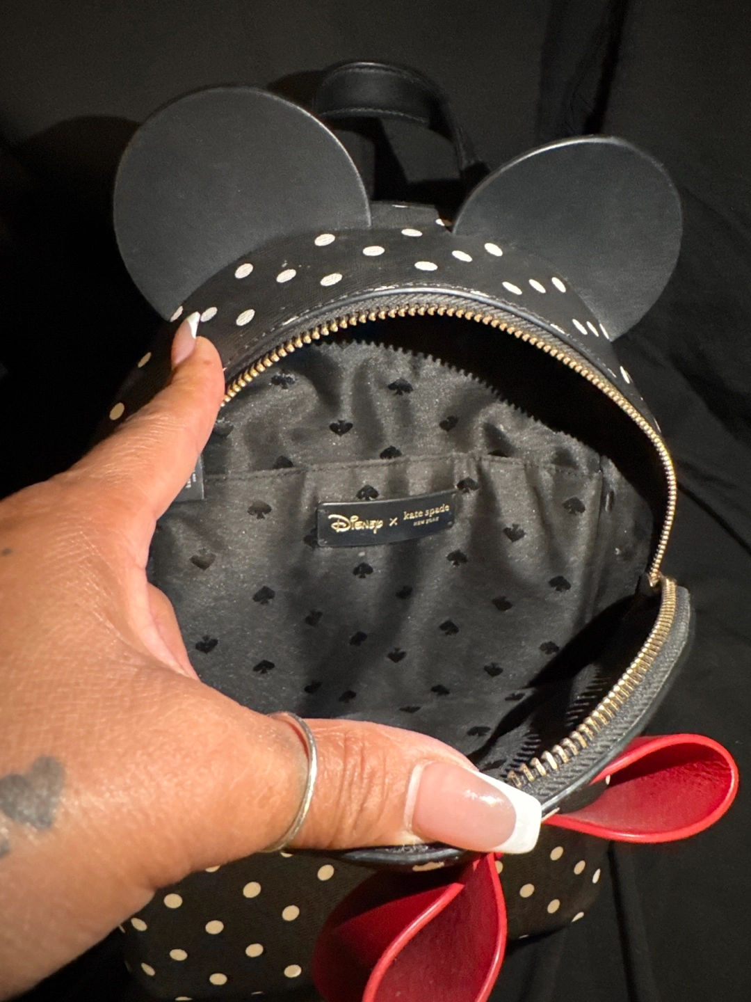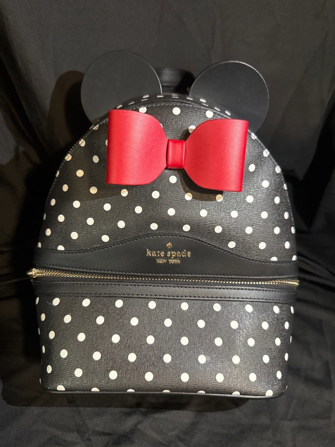 Super cute Kate Spade backpack featuring a Minnie Mouse polka dot design! It's perfect for adding a touch of fun to your everyday look. The backpack has adjustable straps and a zippered closure to keep your belongings safe and secure. The interior has a Disney x Kate Spade lining.