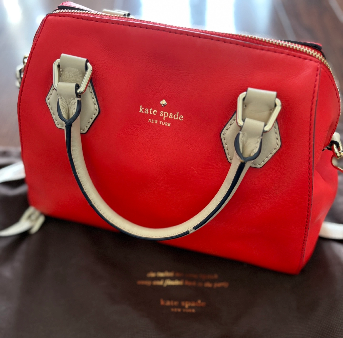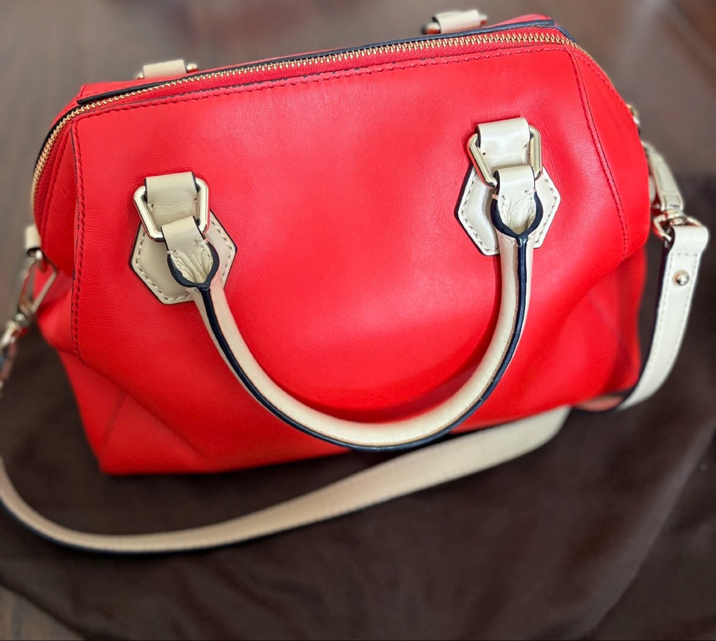 Gorgeous red leather handbag. Top handles and crossbody strap. Zip closure. Pre-owned, excellent condition.