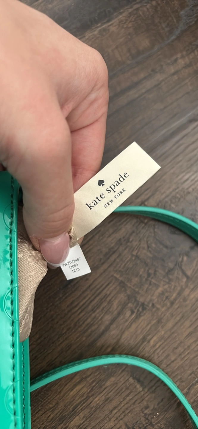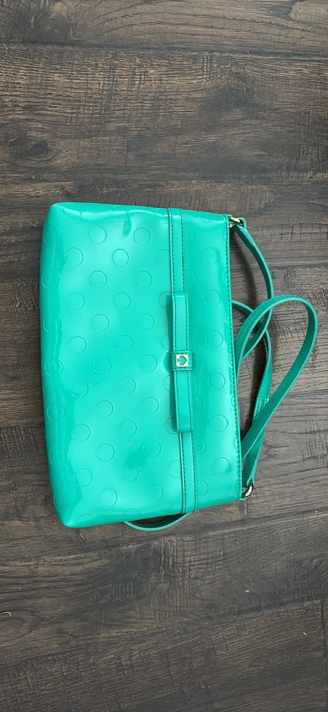 Pre-owned Kate Spade New York crossbody bag. Teal patent leather. Circular embossed pattern. strap cross body. Interior zip pocket.