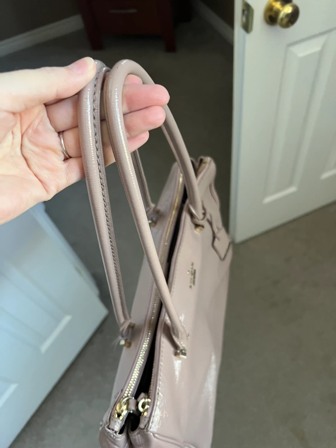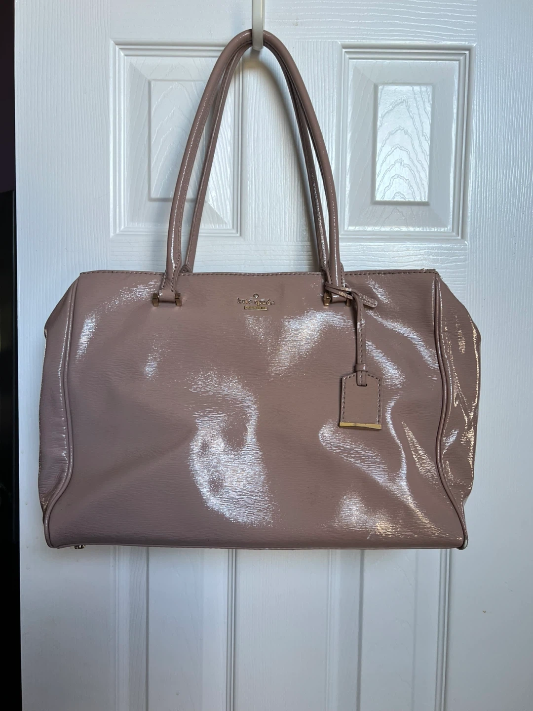 A lovely Kate Spade New York tote bag! It's a beautiful neutral colour with a fun polka dot interior. Perfect for everyday use or as a stylish work bag. It's in great condition and ready for a new home!