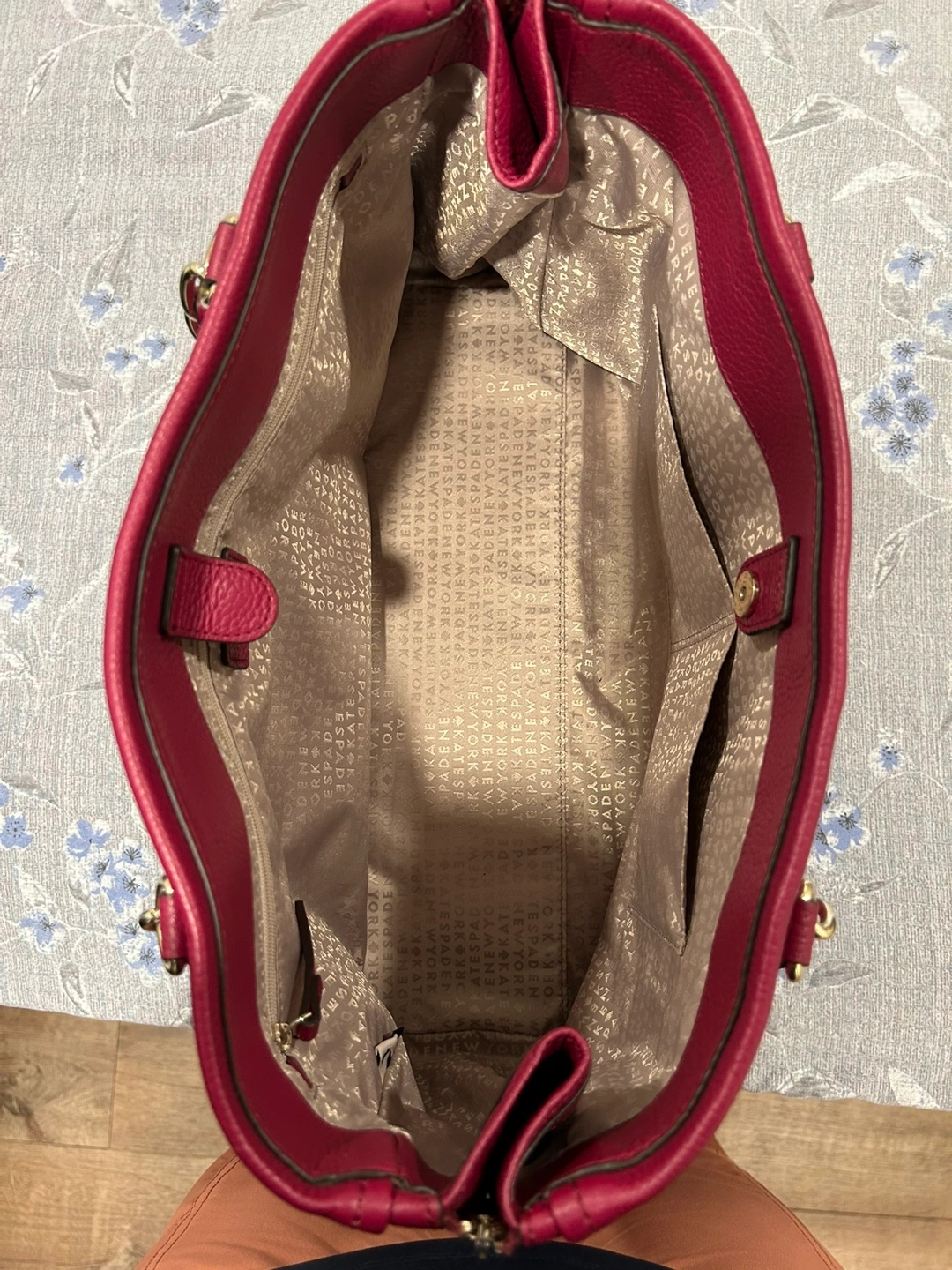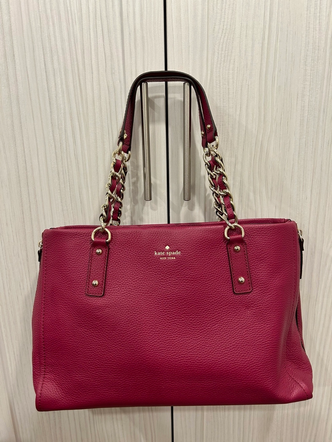 A beautiful tote bag in a vibrant colour. Features chain straps and a spacious interior. Inside, there are various compartments for organization. Consider this bag for your daily essentials Used 1month