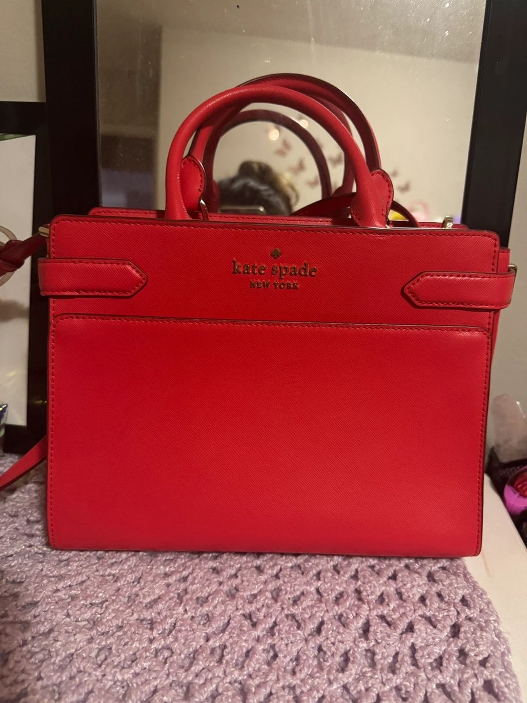 Selling a Kate Spade satchel in a vibrant red colour! It's in great condition and ready for a new home. Perfect for adding a pop of colour to any outfit Selling this bag because I don’t use it anymore. I have a lot of other bags, so I’m letting this one go to someone who will enjoy it more. Only used it for a couple of times and it’s in great condition.