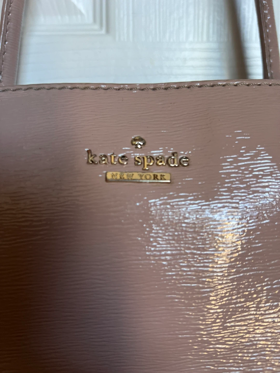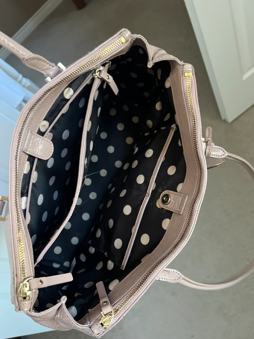 Selling a Kate Spade New York tote bag. It's in great condition and features a stylish design with a glossy finish. The interior has a fun polka dot lining with multiple compartments. Perfect for everyday use!