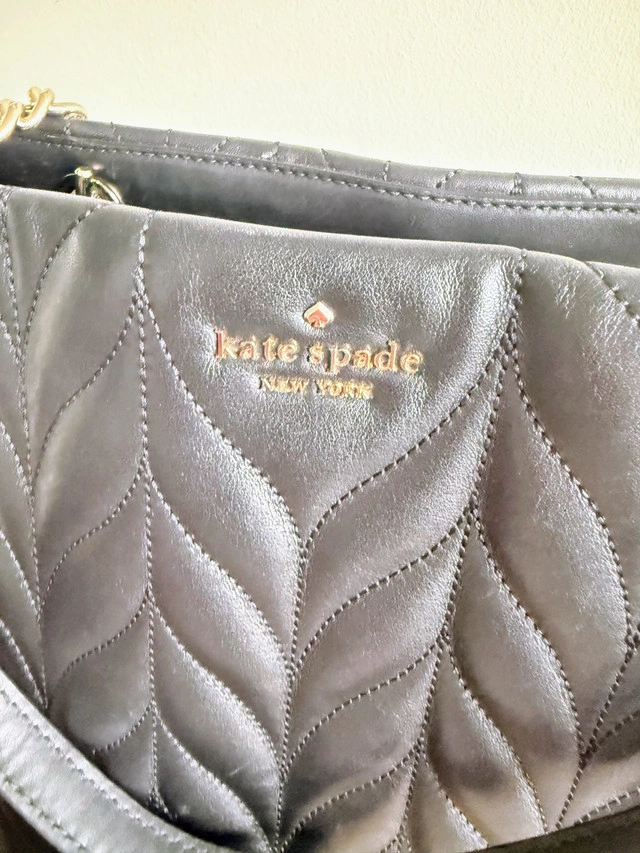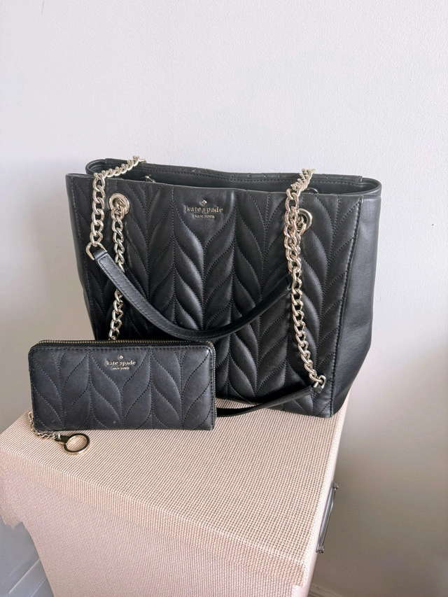 This stylish Kate Spade set includes a quilted black leather tote bag and a matching wallet. The tote features chain detailing and a spacious interior, while the wallet offers ample card slots and a zip closure. This set is in used-good condition and is perfect for everyday use, adding a touch of elegance to any outfit. I’m selling lots of great items that need to go. Buy more from me and make a deal!