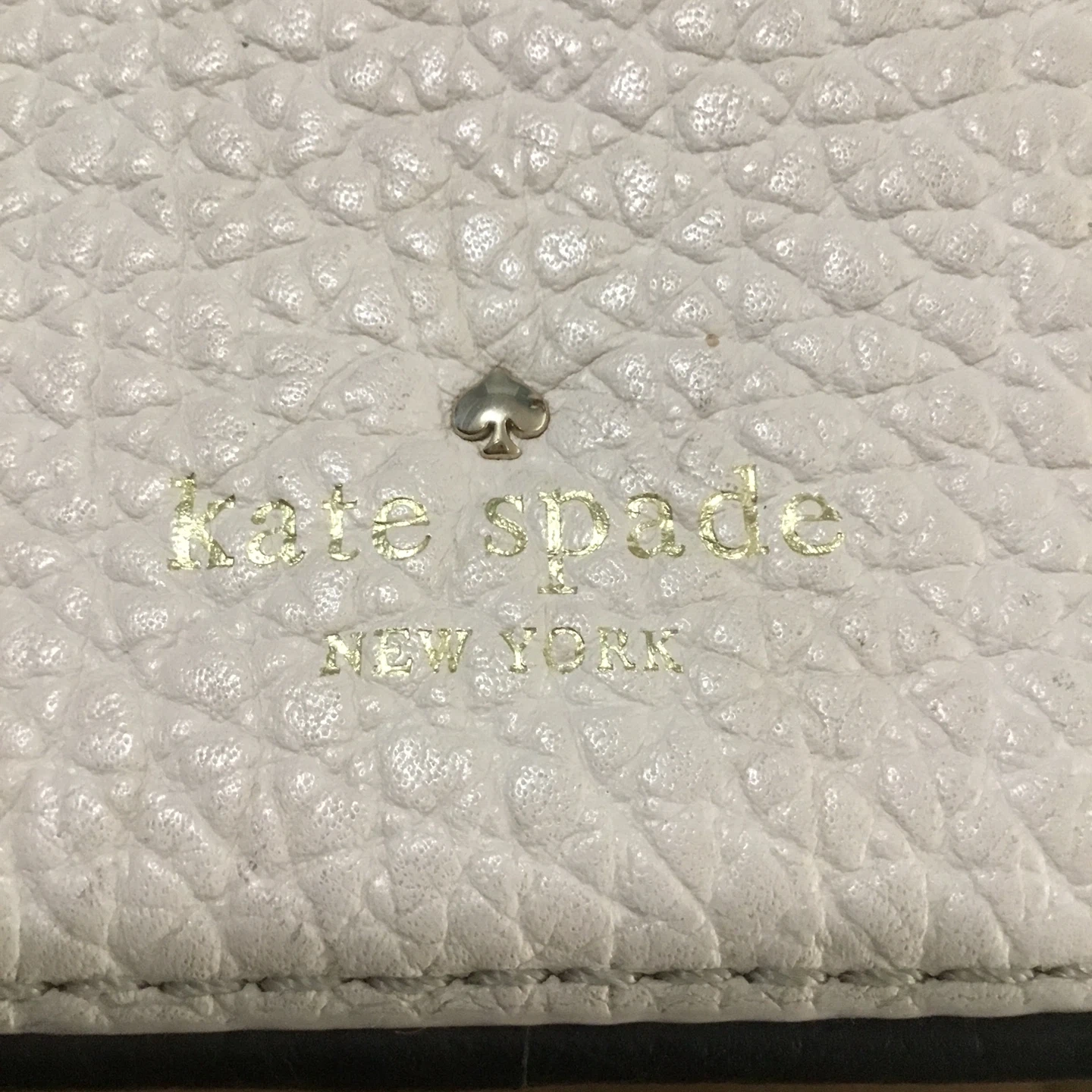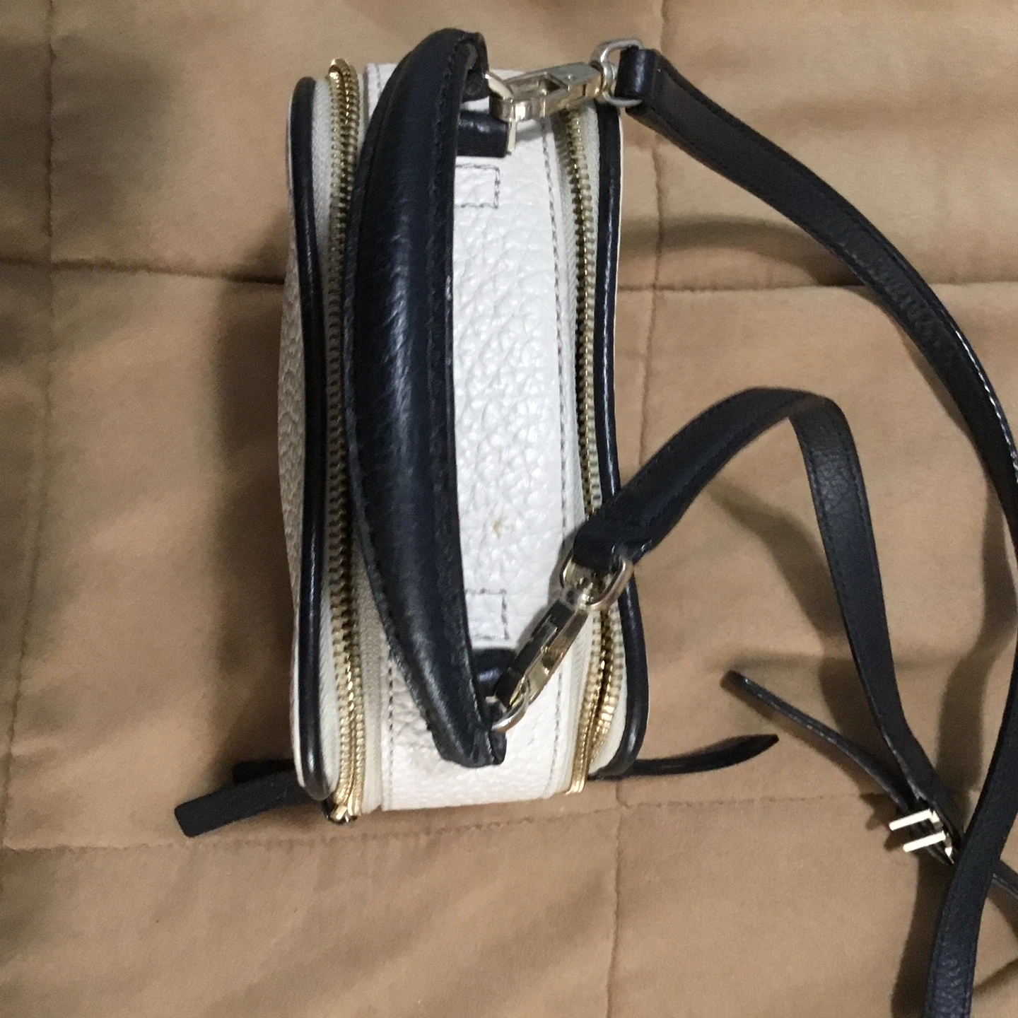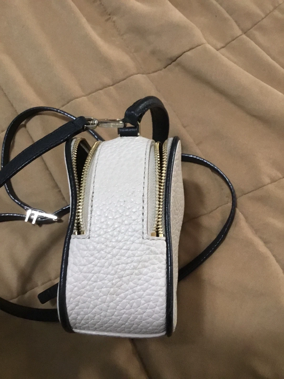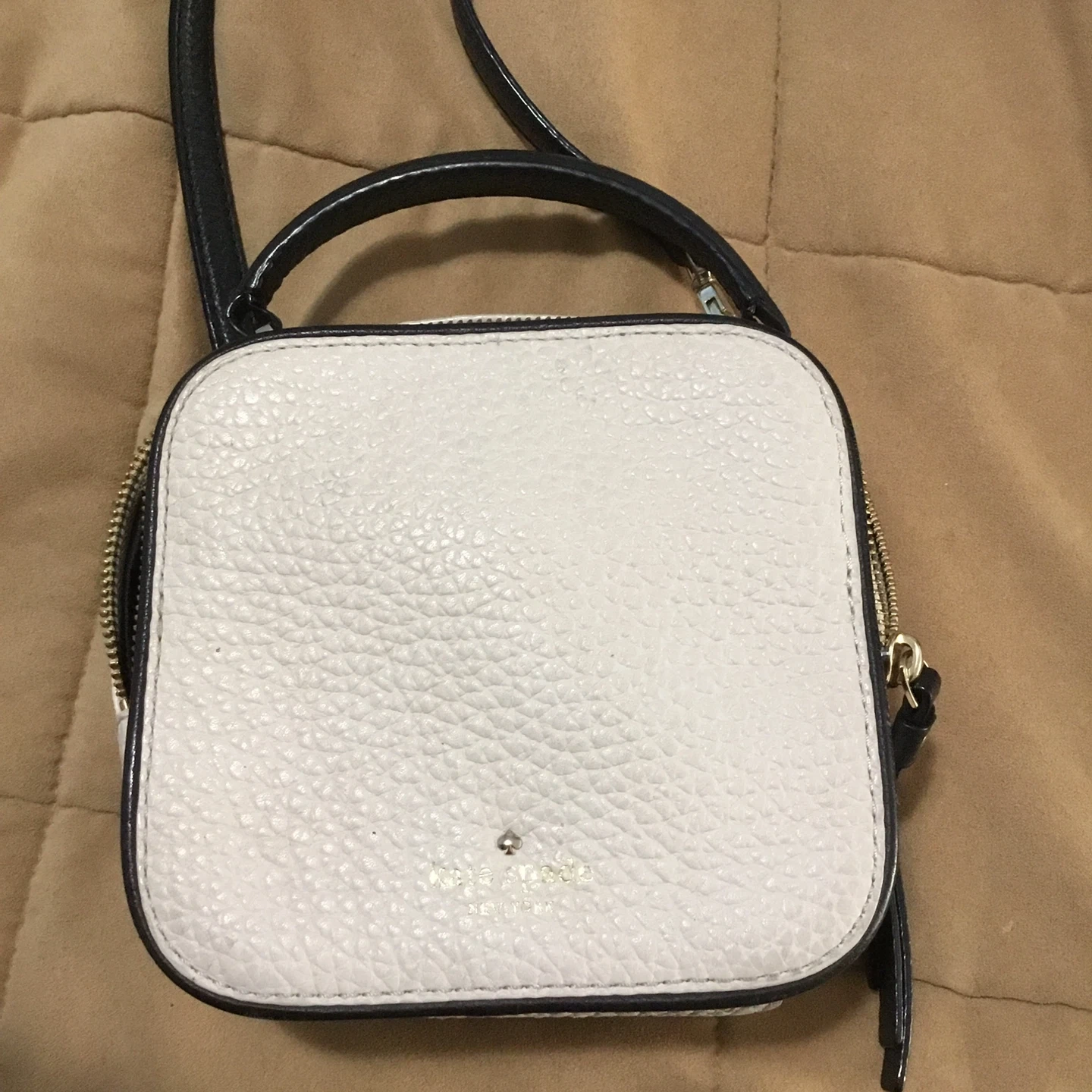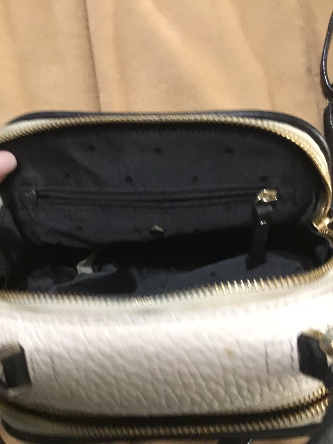 This is a cute Kate Spade crossbody bag! It's beige leather with black trim and gold zippers. The interior is black with a small zippered pocket. Great for everyday use!