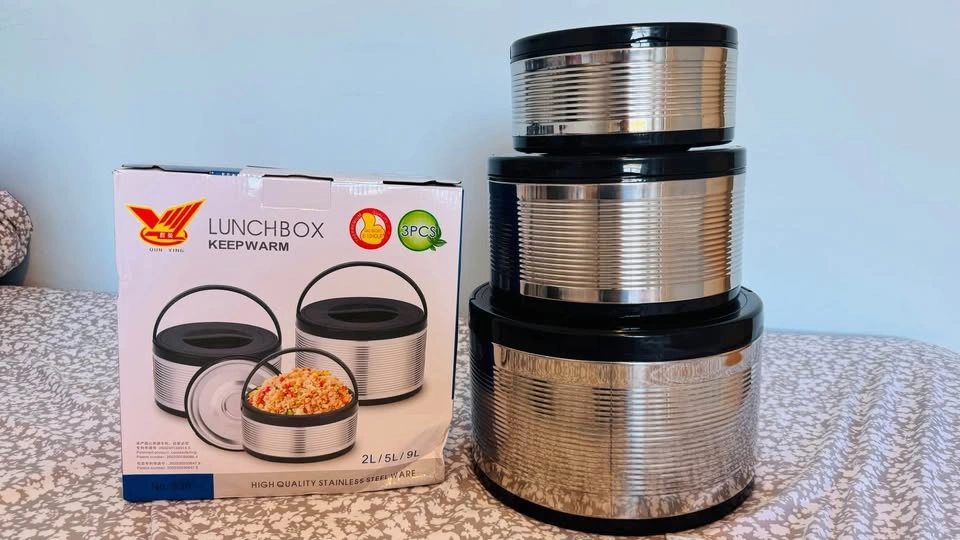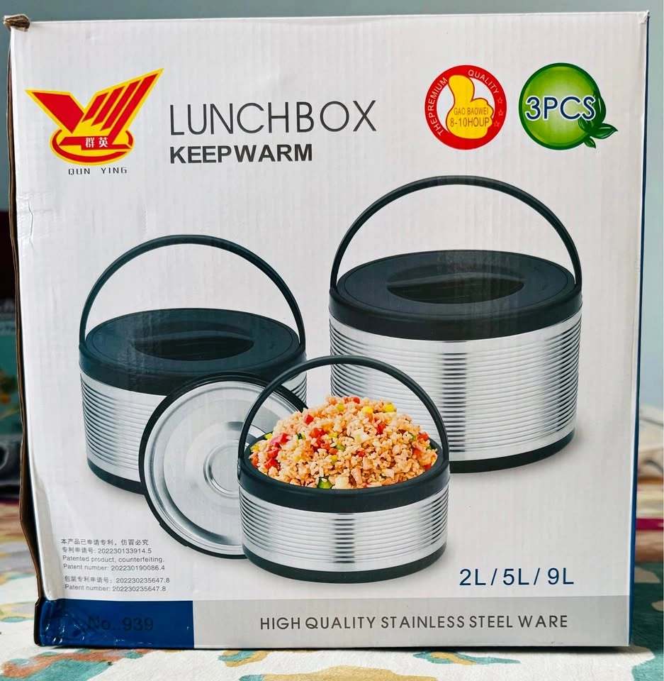 Keep your meals fresh and warm wherever you go with our premium stainless steel lunchboxes. Designed for durability and easy cleaning, these containers are perfect for daily use, whether you're heading to the office, school, or on a trip. Available Sizes: · 2L: Ideal for individual meals, great for lunch or snacks · 5L: Suitable for two people or larger portions · 9L: Perfect for families or groups, excellent for gatherings or picnics Key Features: · Keeps food warm for hours · Made from high-quality, food-grade stainless steel · Easy to carry and use · Air-tight design to preserve freshness Perfect For: · Office lunches · Traveling with meals · School meals for kids · Picnics and day trips Let me know if you're interested!