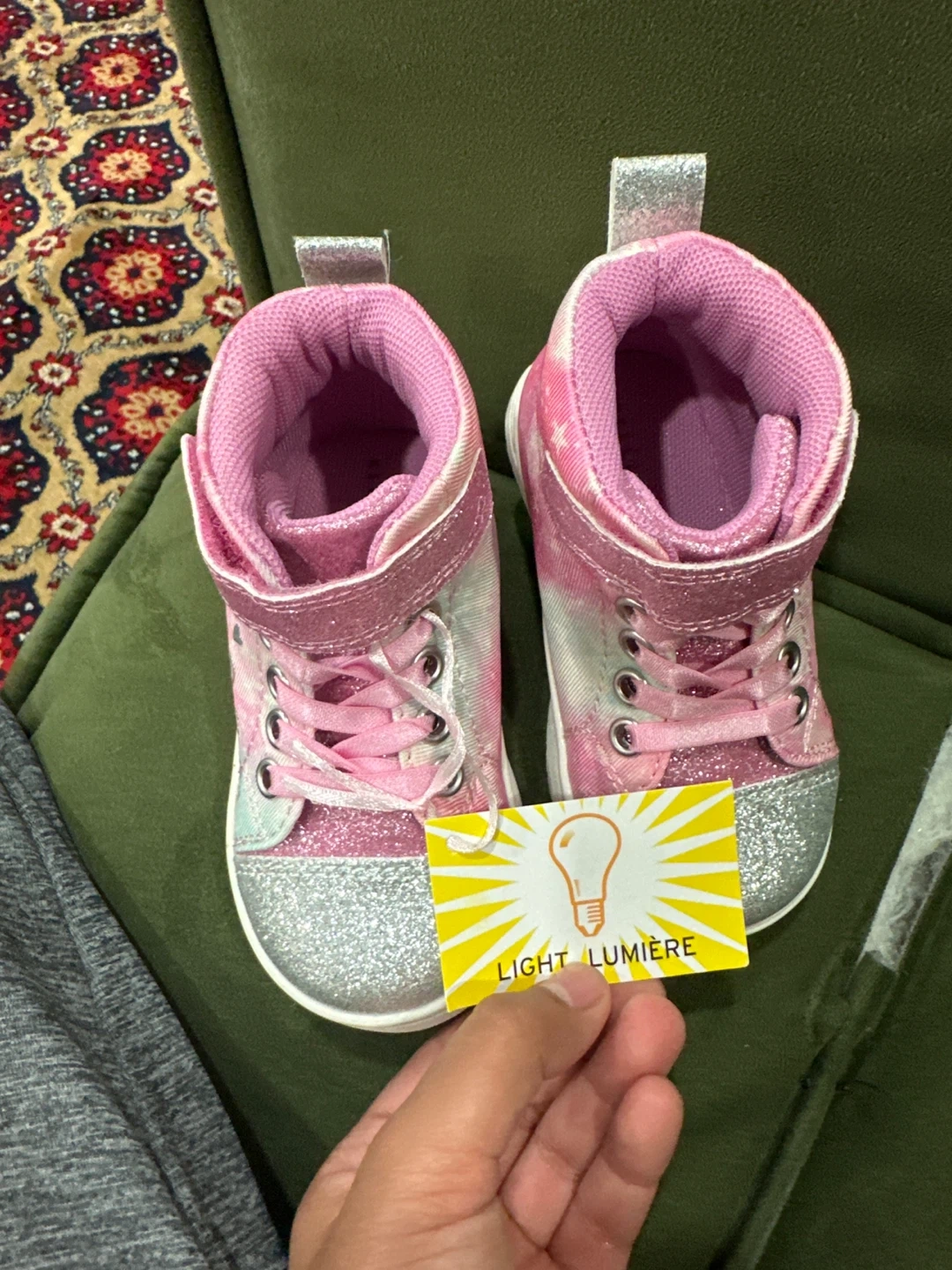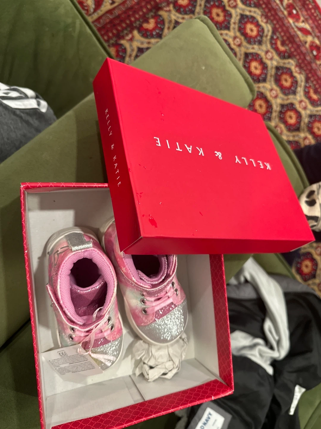 These adorable Kelly & Katie Sparklehi shoes are perfect for your little one! They're a size 6 and feature a cute pink and silver glitter design. The box is included! Good for kids