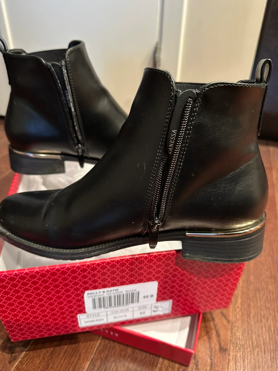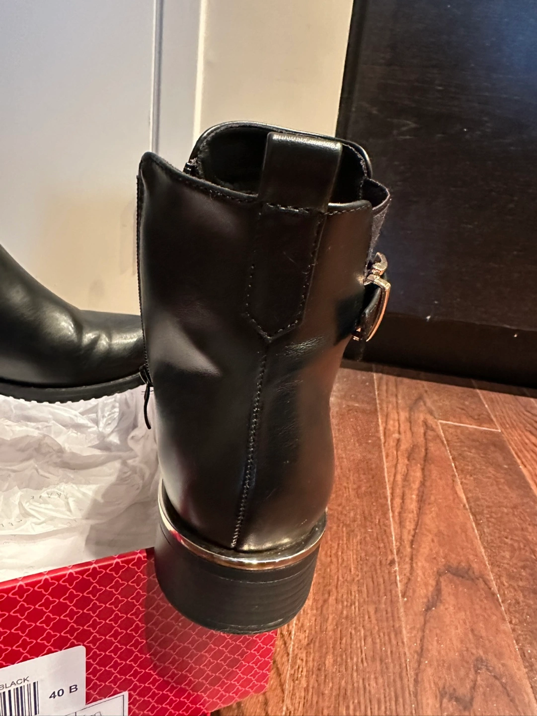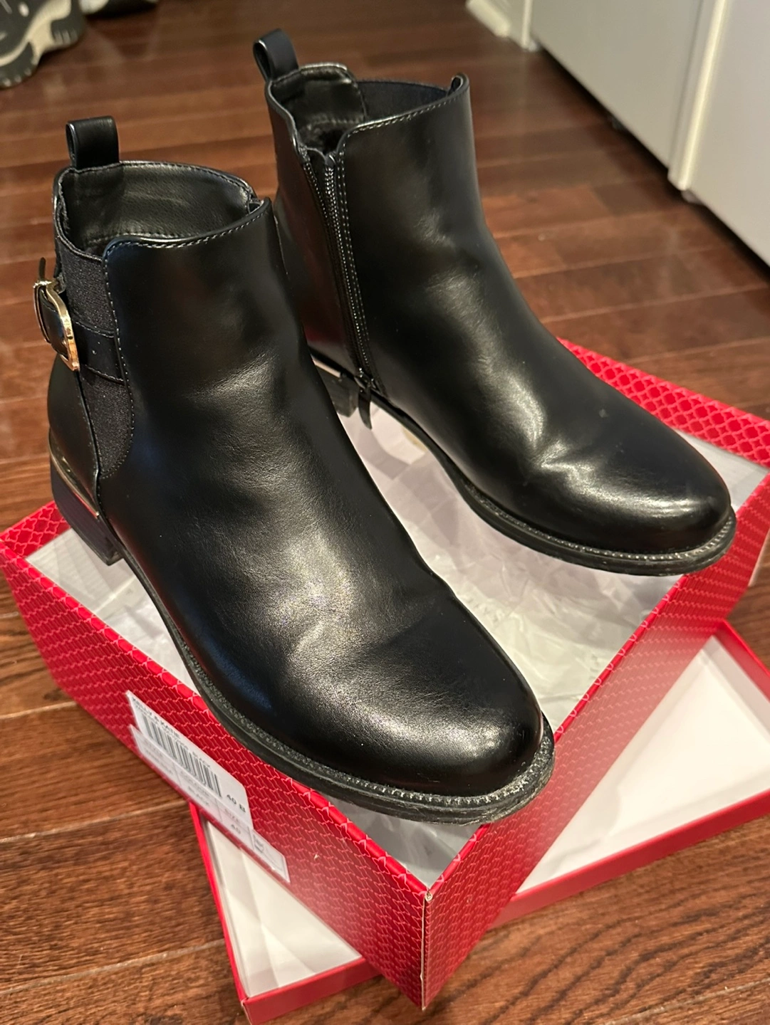 Black ankle boots with gold buckle detail. Side zipper closure. Slight heel. Fleece lining, so warm for winter. Like New in box. Only worn once but they are too small for me. Retails for $60. Asking $30. Pet free, smoke free home.