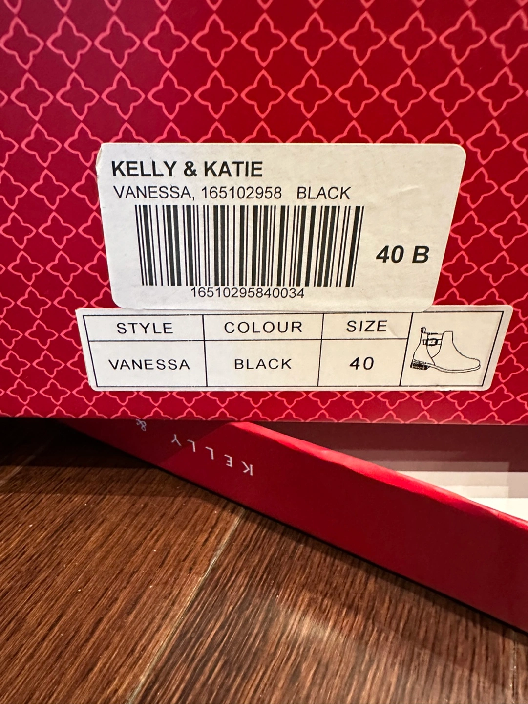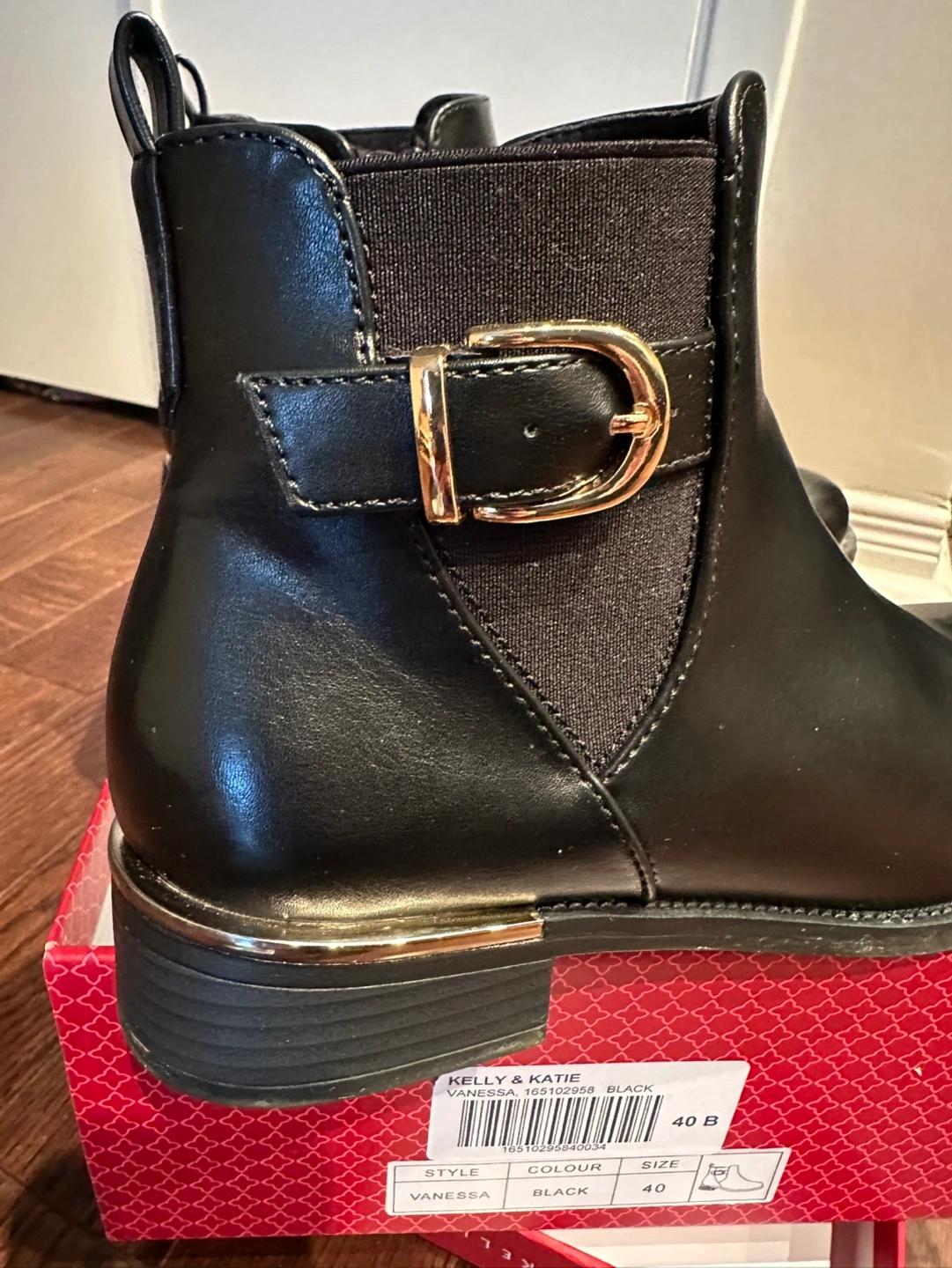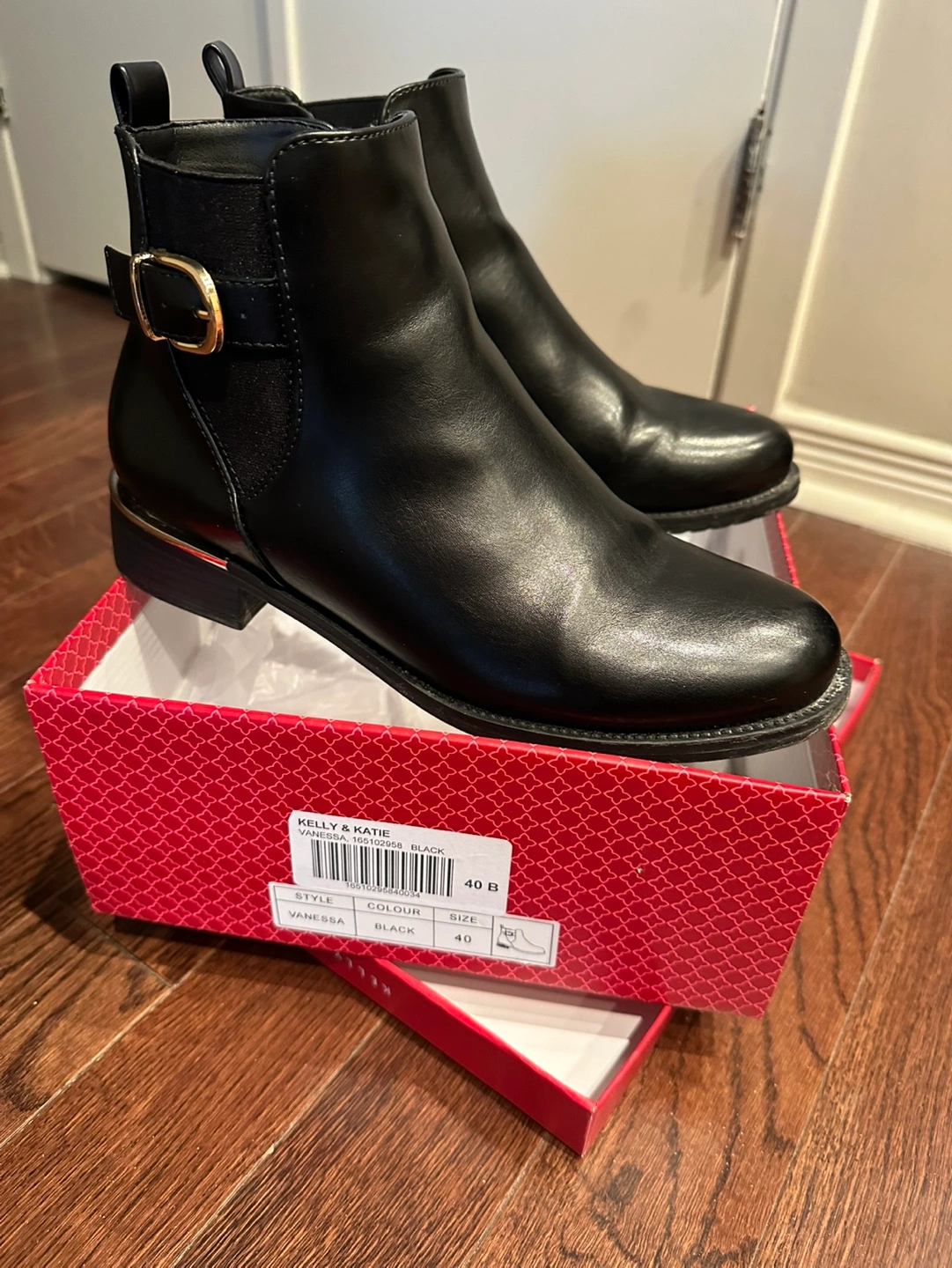 Black ankle boots with gold buckle detail. Side zipper closure. Slight heel. Fleece lining, so warm for winter. Like New in box. Only worn once but they are too small for me. Retails for $60. Asking $30. Pet free, smoke free home.