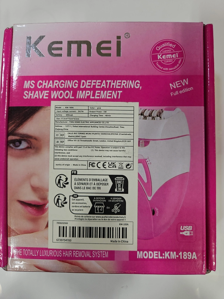 Selling a brand new Kemei KM-189A lady epilator, still in its original box! This is the full edition and comes with all the accessories you see in the picture, including the instruction manual, cleaning brush, and charging cable. It's pink and ready to help with your hair removal needs