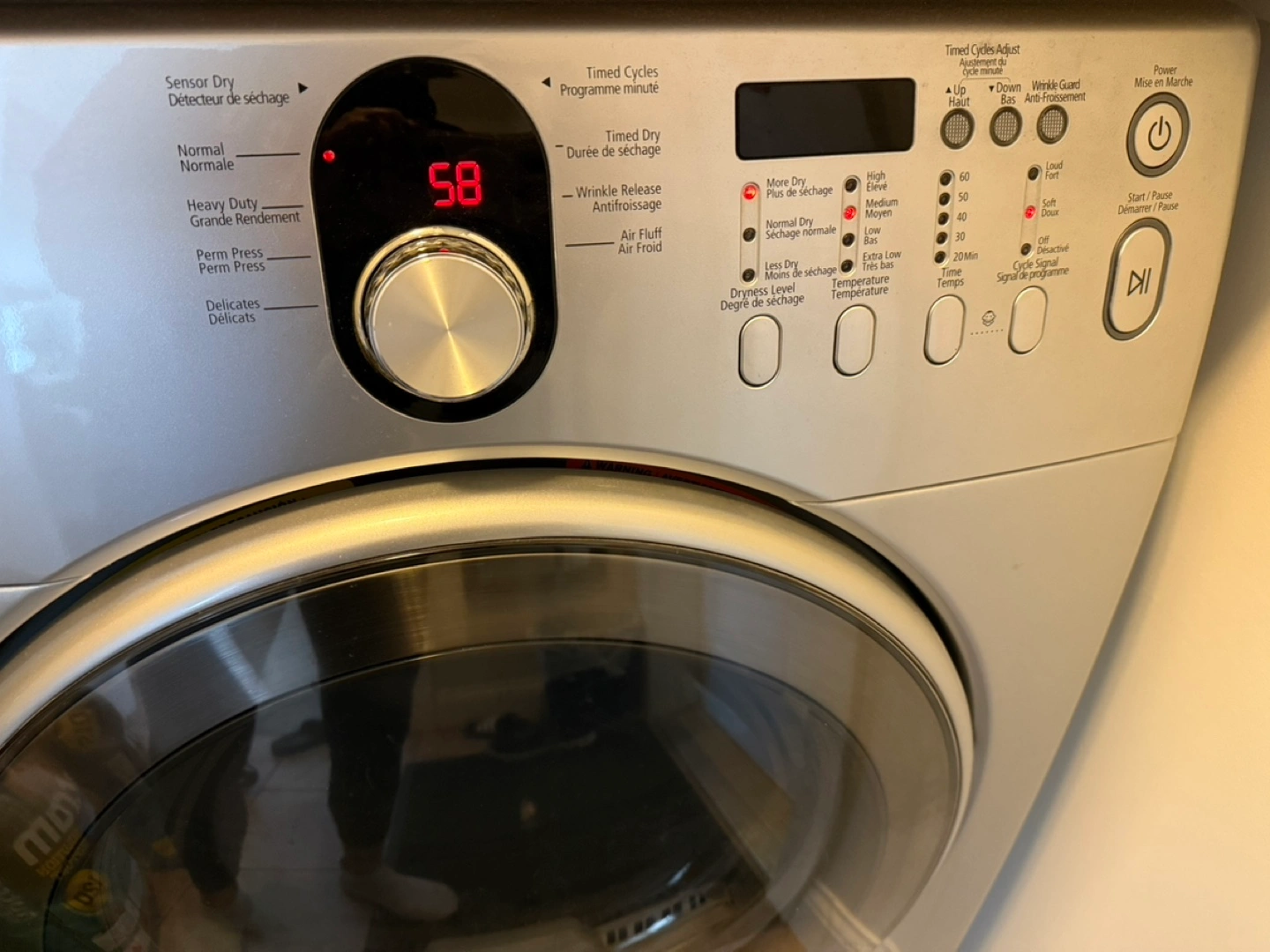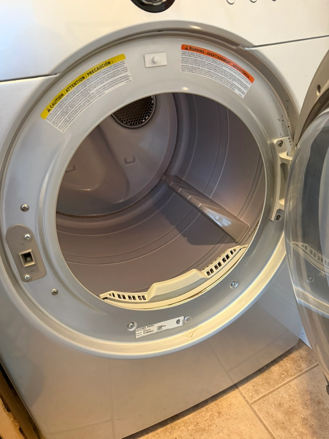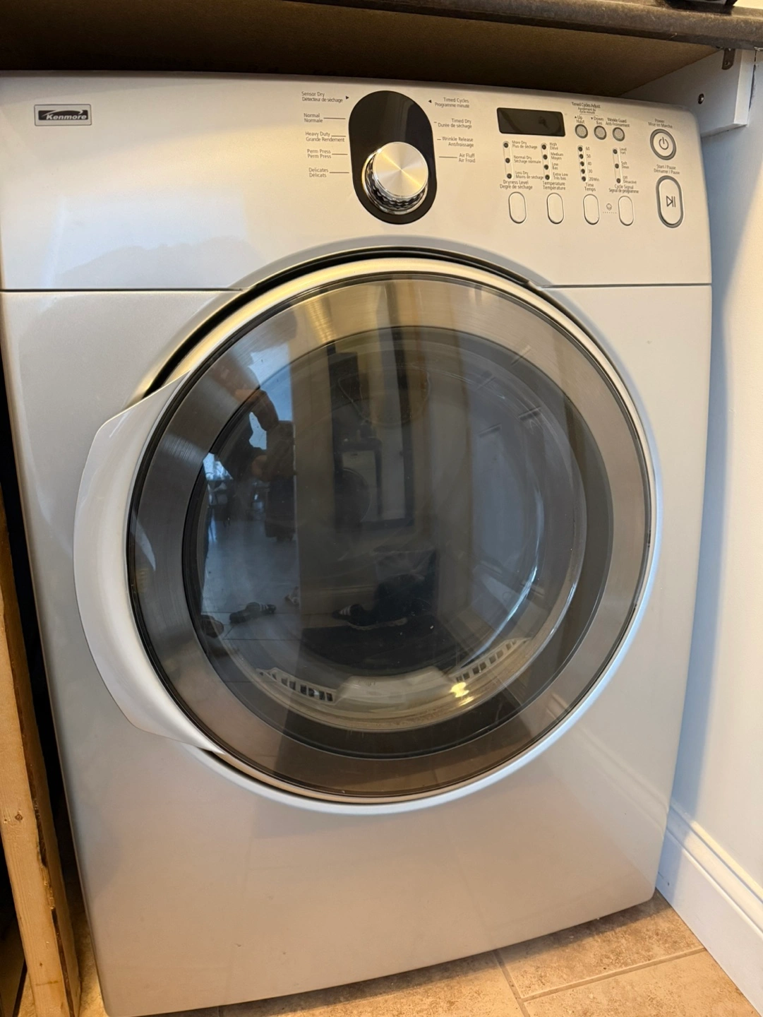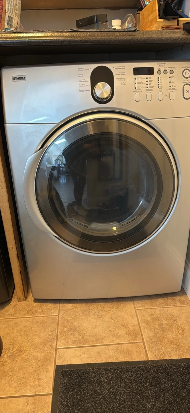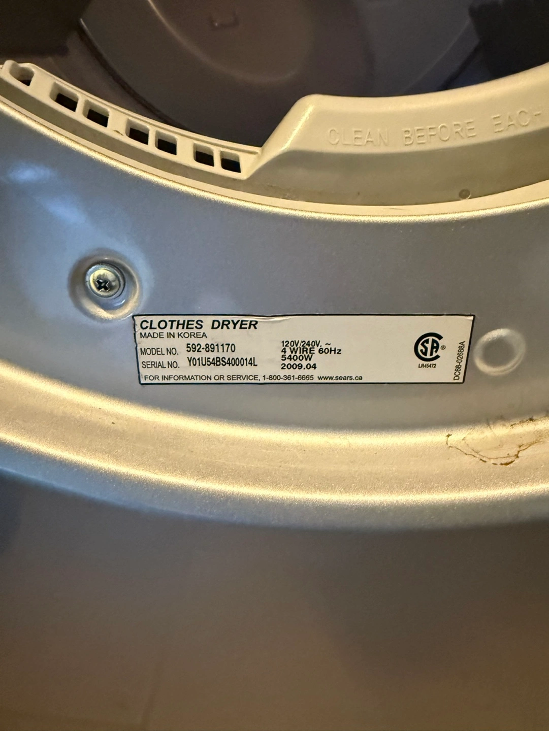 Electric dryer, silver colour. Model No. 592-891170. Features various drying cycles and options. Good condition.